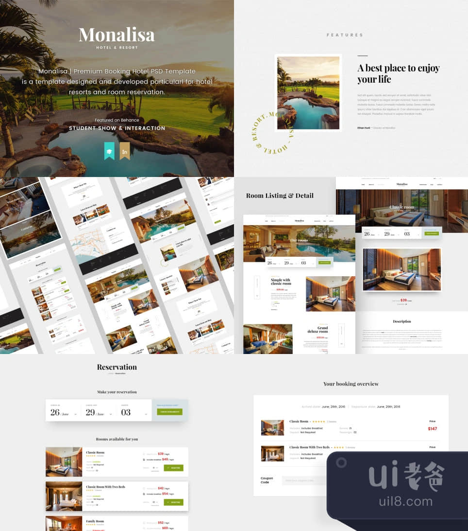 Monalisa | 高级旅游预订酒店PSD模板是一个特别为酒店、度假村和房间预订设计和开发的模板。干净和时尚的设计,字体Playfair Display和Poppin之间的伟大组合,为任何人使用这个模板带来豪华的设计。让Monalisa为你的网站带来惊人的效果。包括09个PSD文件 - 设计是非常有创意和独特的,也非常容易定制和使用。