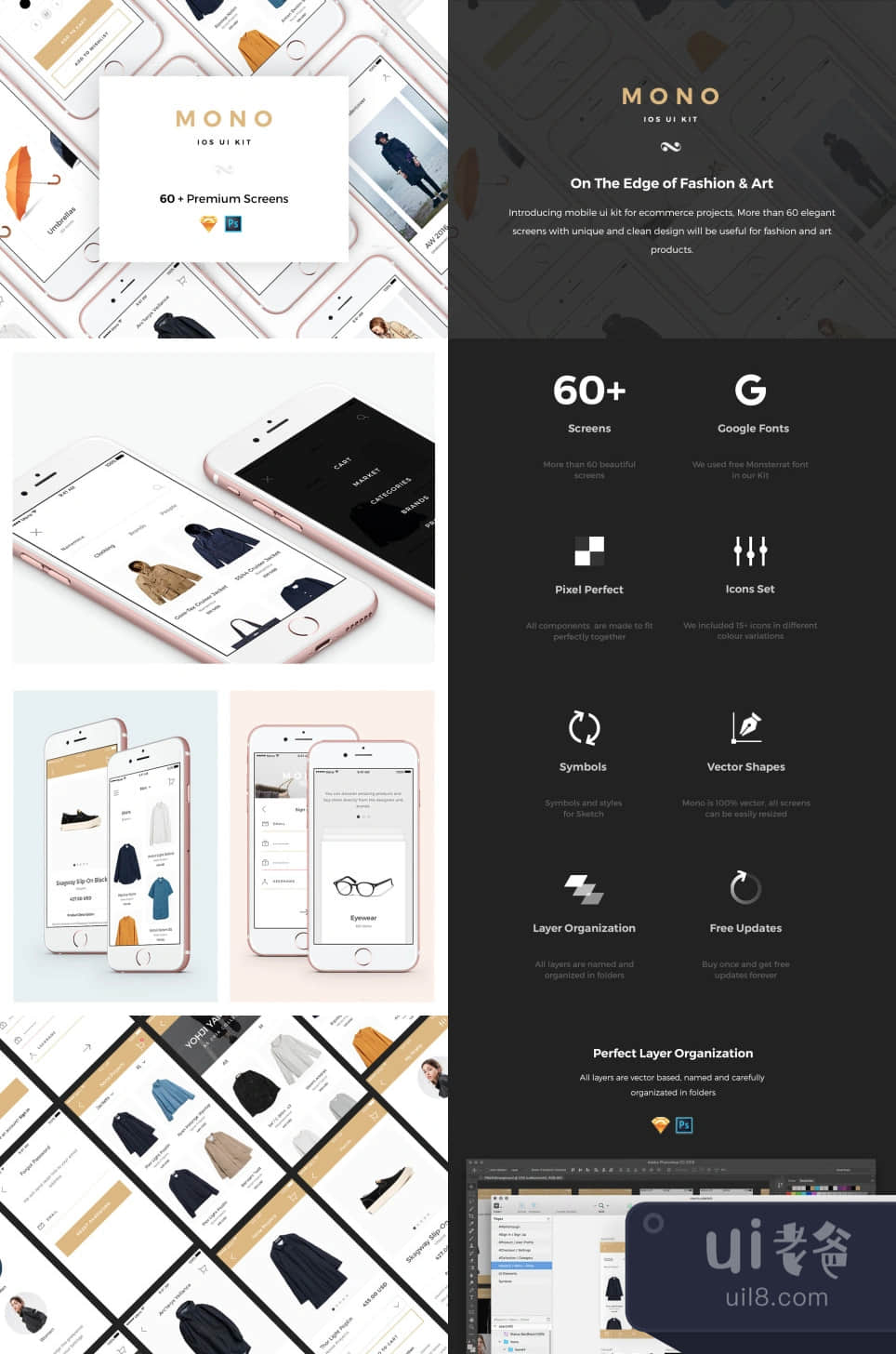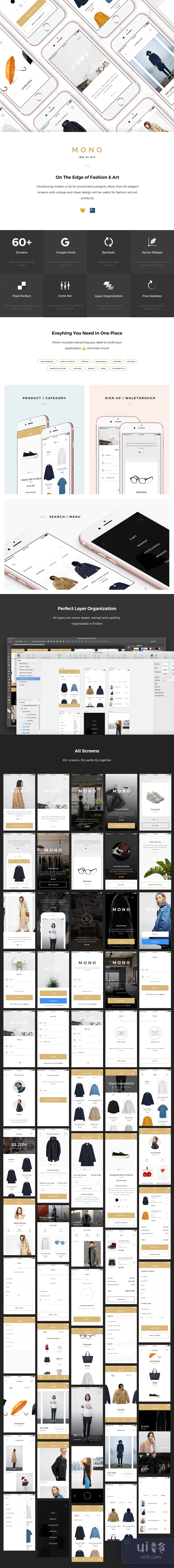 介绍用于电子商务项目的移动UI套件。10个类别的60多个优雅的屏幕,独特而简洁的设计,将有助于时尚和艺术产品。Mono包括你需要建立你的应用程序的一切,甚至更多完美的图层组织,所有的图层都是基于矢量的,命名并精心组织在文件夹里。与Sketch 3.7+和Photoshop CC+兼容。