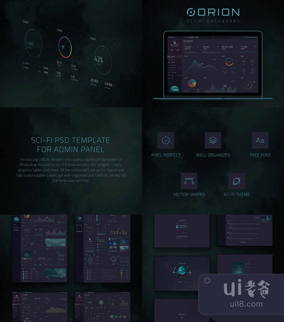 介绍一下ORION;一个现代和创造性的Photoshop仪表板模板,专注于科幻主题。Orion包括70多个部件、图表、图形、表格等。所有的组件都是基于矢量的,完全可定制。各层组织良好,命名严谨。所有使用的字体都是免费的。