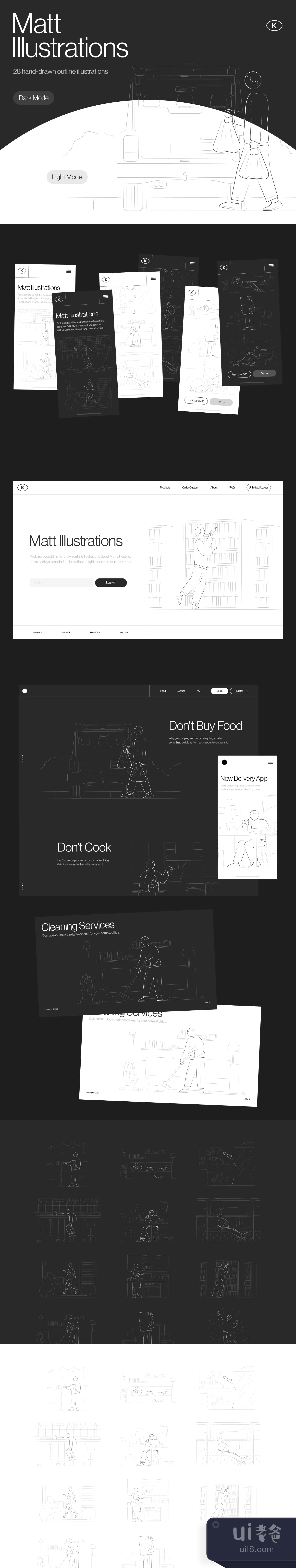Matt展示了我们的日常活动,如遛狗、买咖啡、饮酒,甚至使用智能手机。这个包包括28幅关于Matt生活方式的手绘轮廓插图。在这个包中,你可以找到14幅用于登陆页面、应用程序、博客和演示文稿的浅色模式的插图和14幅深色模式的插图。个人和商业使用的许可证将花费你22美元。为了检查插图的质量,你可以下载一个免费演示。你会收到一个所有格式的场景(AI、EPS、PDF、SVG和PNG)。