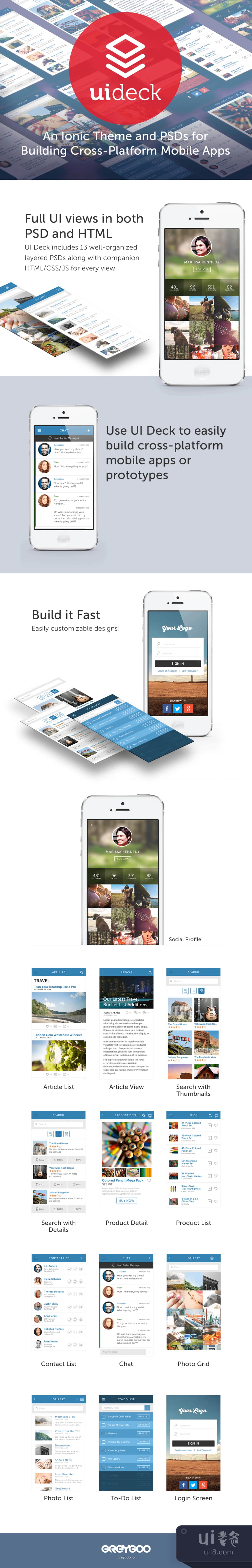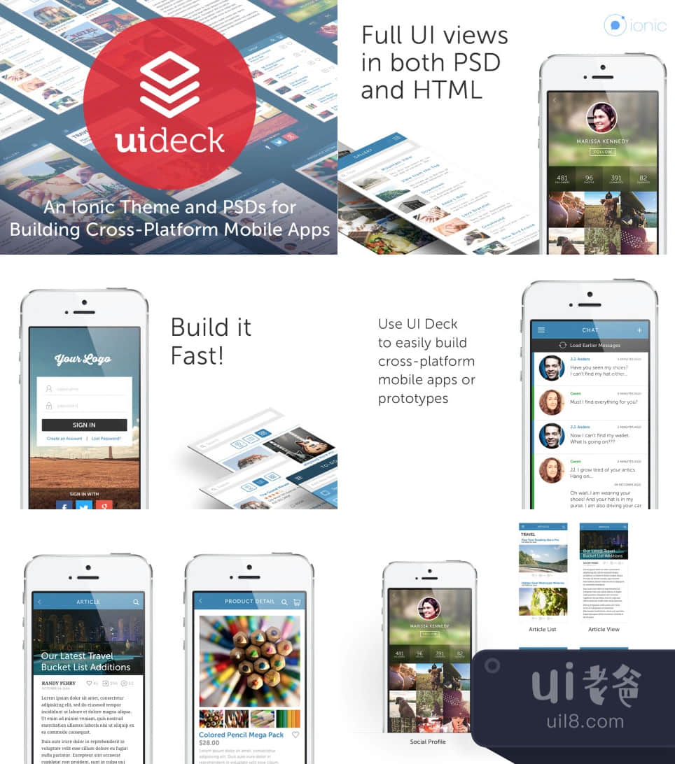 无论你是在建立一个HTML5移动应用程序,移动网站或原型,UI Deck for mobile是一个灵活的集合,其中有13个易于定制的视图,使用Ionic.io框架构建。使用UI Deck作为启动主题,用PhoneGap/Cordova、Meteor、Trigger.io、AppGyver等构建跨平台的移动应用。你将得到13个有组织、有层次的PSD和完整的HTML/CSS/JS,用于13个视图中的每一个,使用干净、有组织的代码。