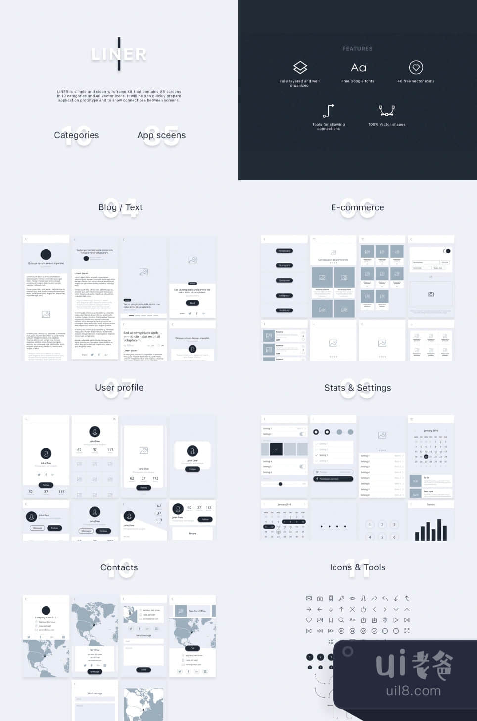Liner是简单而干净的线框套件,包含10个类别的85个屏幕和46个矢量图标。它将有助于快速准备应用程序的原型,并显示屏幕之间的连接。