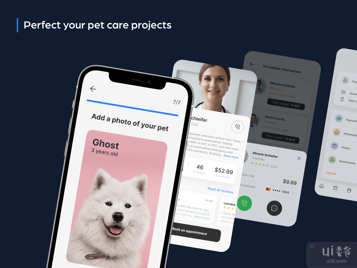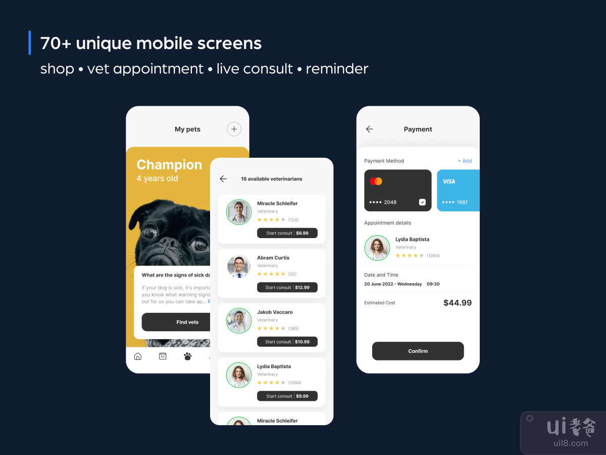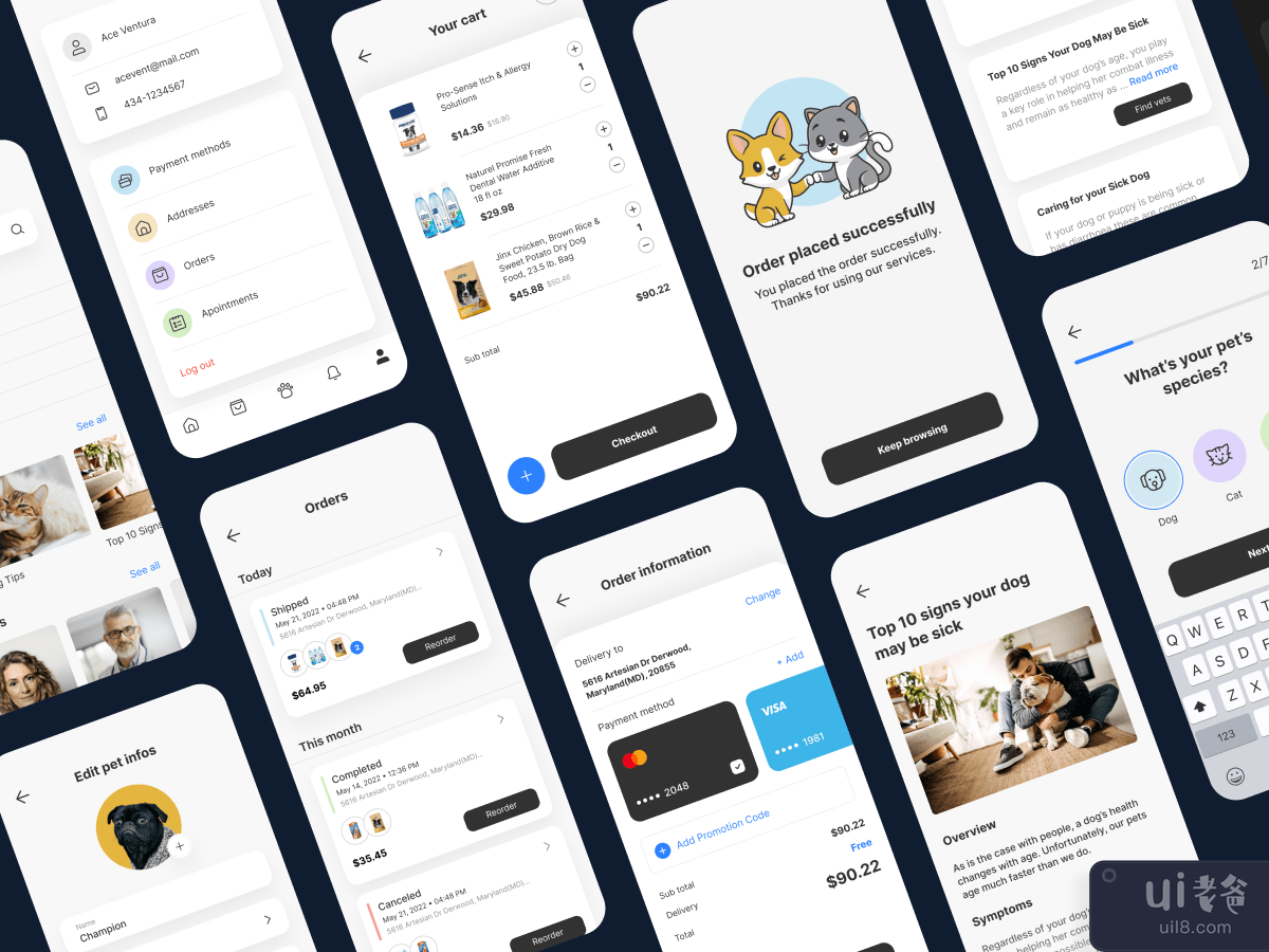 Petito Pet Care App UI Design Kit is a high quality pack designed for pet care mobile app. The package containing tons of useful components to create mobile apps. When you purchase Petito Pet Care App, you'll get 70+ screens designed for pet shopping, vet appointments, adding reminders and live consulting flows (FigJam document included)