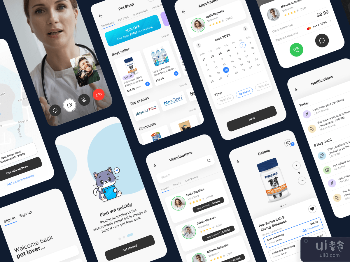 Petito 宠物护理应用程序 UI 设计套件是专为宠物护理移动应用程序设计的高品质包。该软件包包含大量用于创建移动应用程序的有用组件。当您购买 Petito Pet Care 应用程序时,您将获得 70 多个专为宠物购物、兽医预约、添加提醒和实时咨询流程而设计的屏幕(包括 FigJam 文档)