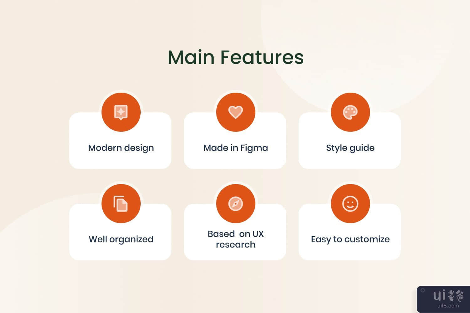 **功能**+ 5 个选定屏幕+ 使用了 Google 字体+ 使用免费网络编辑器 Figma 进行编辑+ 所有组和图层都井井有条