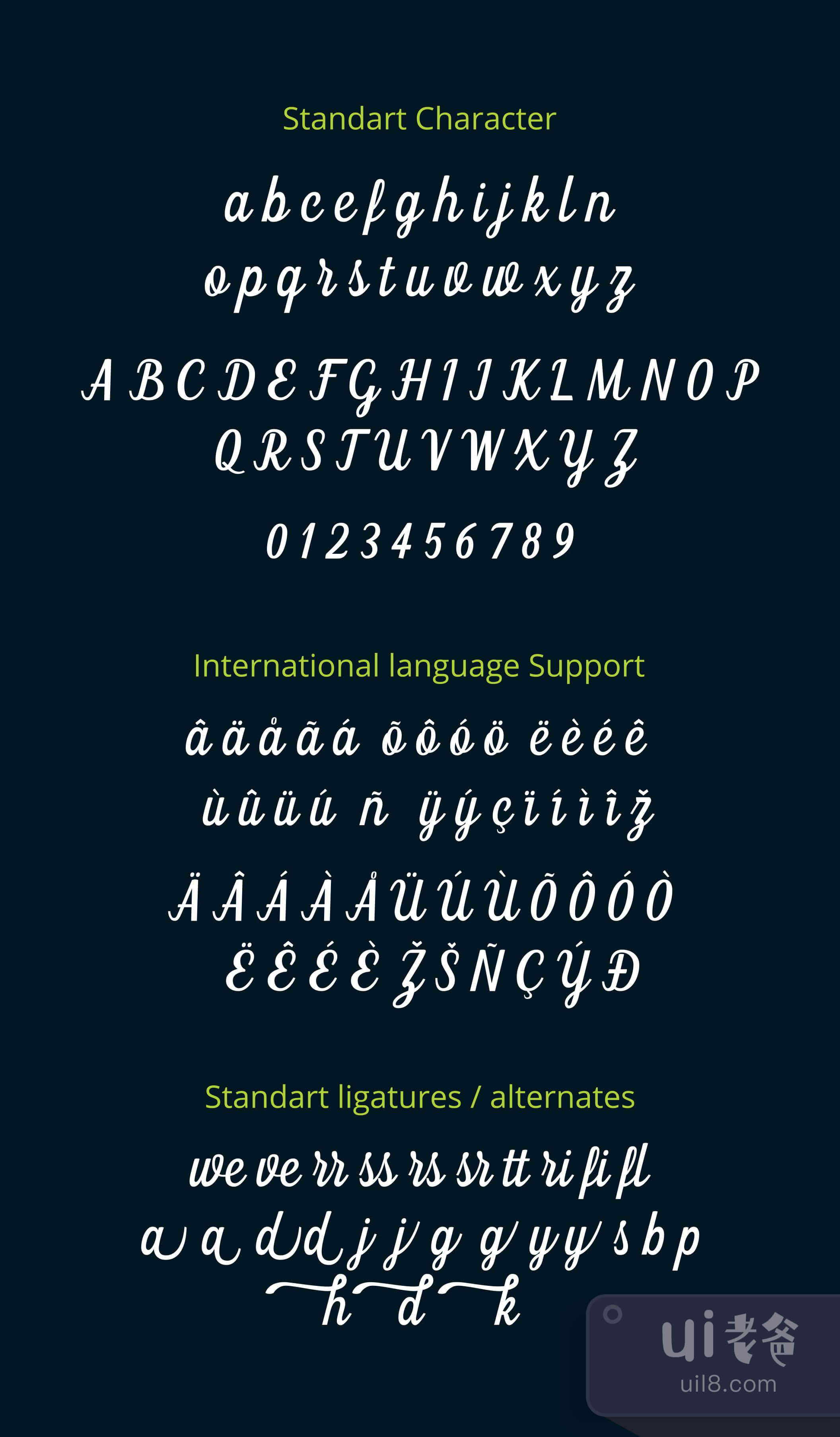 为展示而设计的正式和现代的脚本字体。总共包含255个字形和更多的替代字符,以改善你的设计! 包括多语言支持、有用的连字符、斜线和更多。流动的字符是制作有吸引力的信息的理想选择!