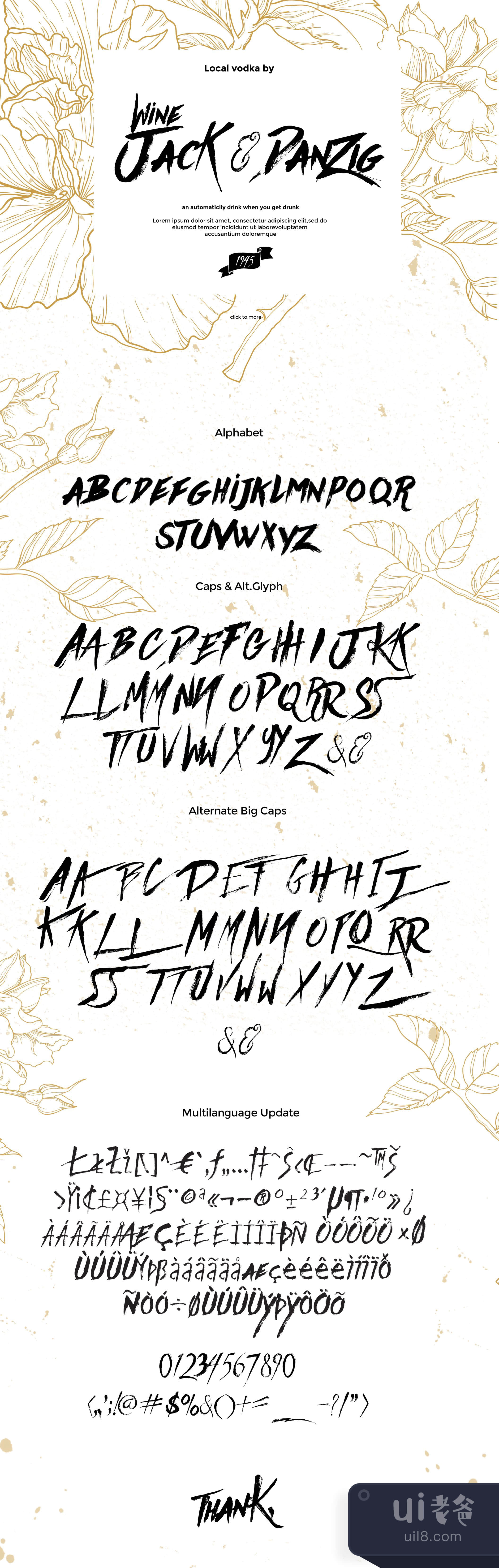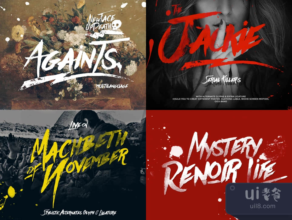 Againts字体的灵感来自于画笔和一些墨水的自然而凌乱的外观。该字体带有交替的字形和额外的连接词,为您提供了广泛的选择,以做出完美的时尚设计非常适用于横幅、服装、标题、封面相册和其他更多的东西。
