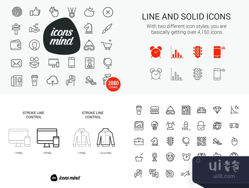 Icons mind是一个巨大的iOS 8、iOS 7和Android图标包,里面有53个不同类别的2,086个图标!你可以轻松地改变它们的颜色、大小。你可以轻松地改变它们的颜色、大小、笔画、方向,并添加阴影以矢量文件、网络字体或Photoshop的自定义形状下载图标,只要适合你的需要。