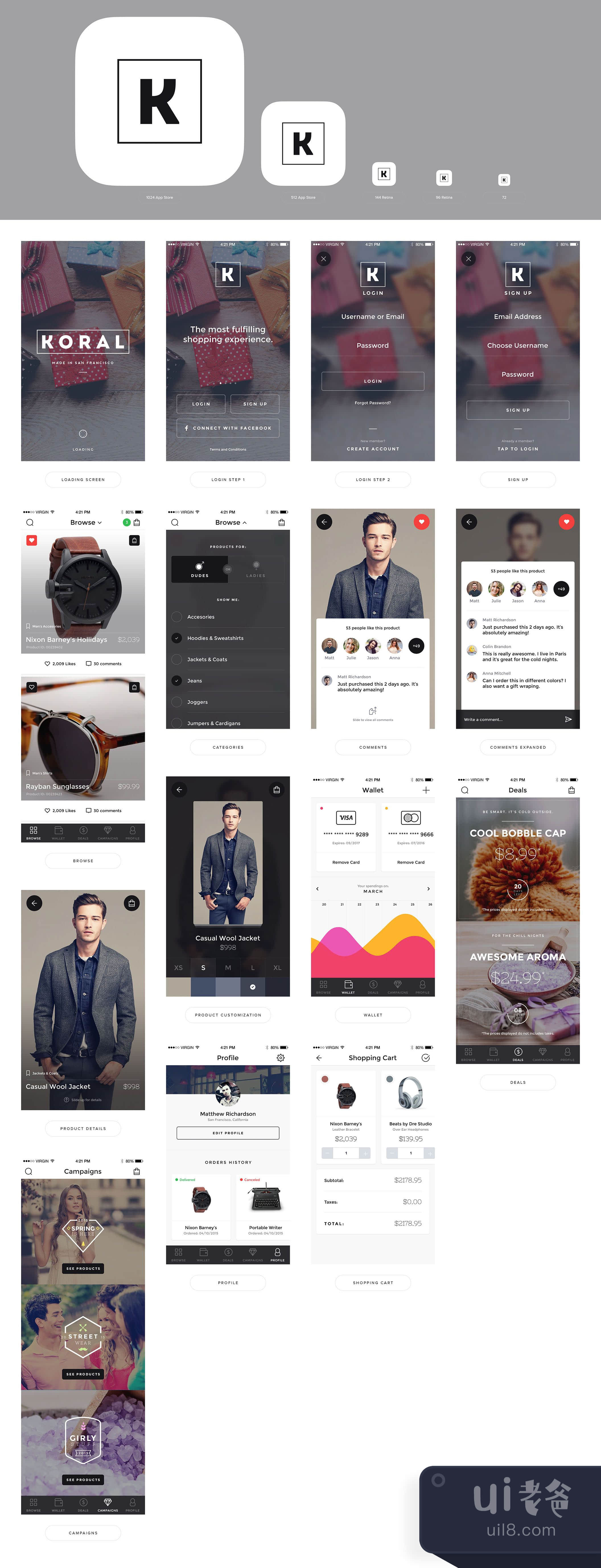 Koral是一个包含15个屏幕的模板包,为iPhone 6(750x1334)设计。整个包以电子商务为导向,它涵盖了所有你需要建立下一个最好的移动商店的屏幕
