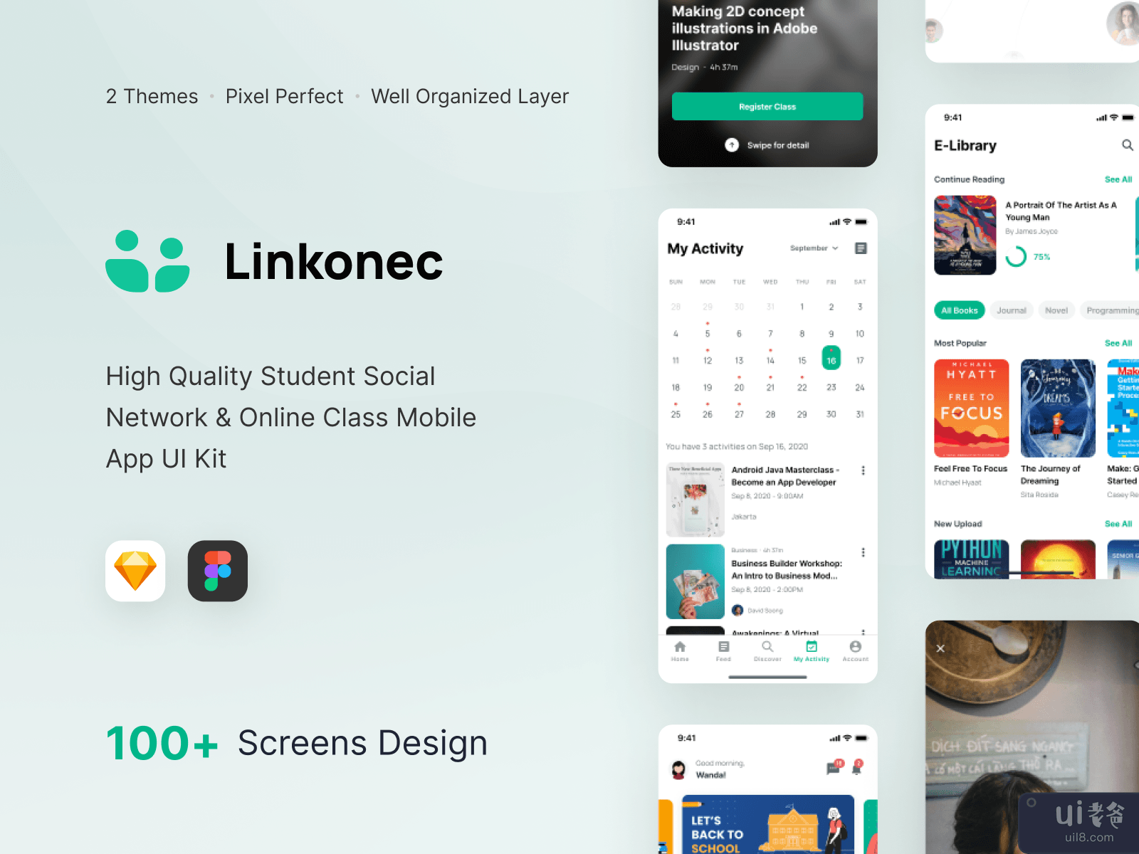 这是 Linkonec,一个用于学生社交网络、社交媒体和在线课堂平台的 UI 工具包。这个移动 UI 工具包不仅旨在帮助学生与他们的朋友和同学联系,还可以将他们与他们的导师或老师联系起来。