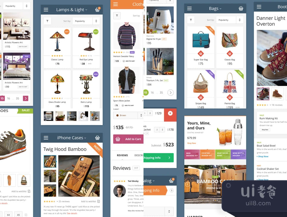 一套庞大的优质组件,涵盖9个内容类别,用于移动和网络电子商务项目。适用于Adobe Photoshop CS6+ (.PSD)