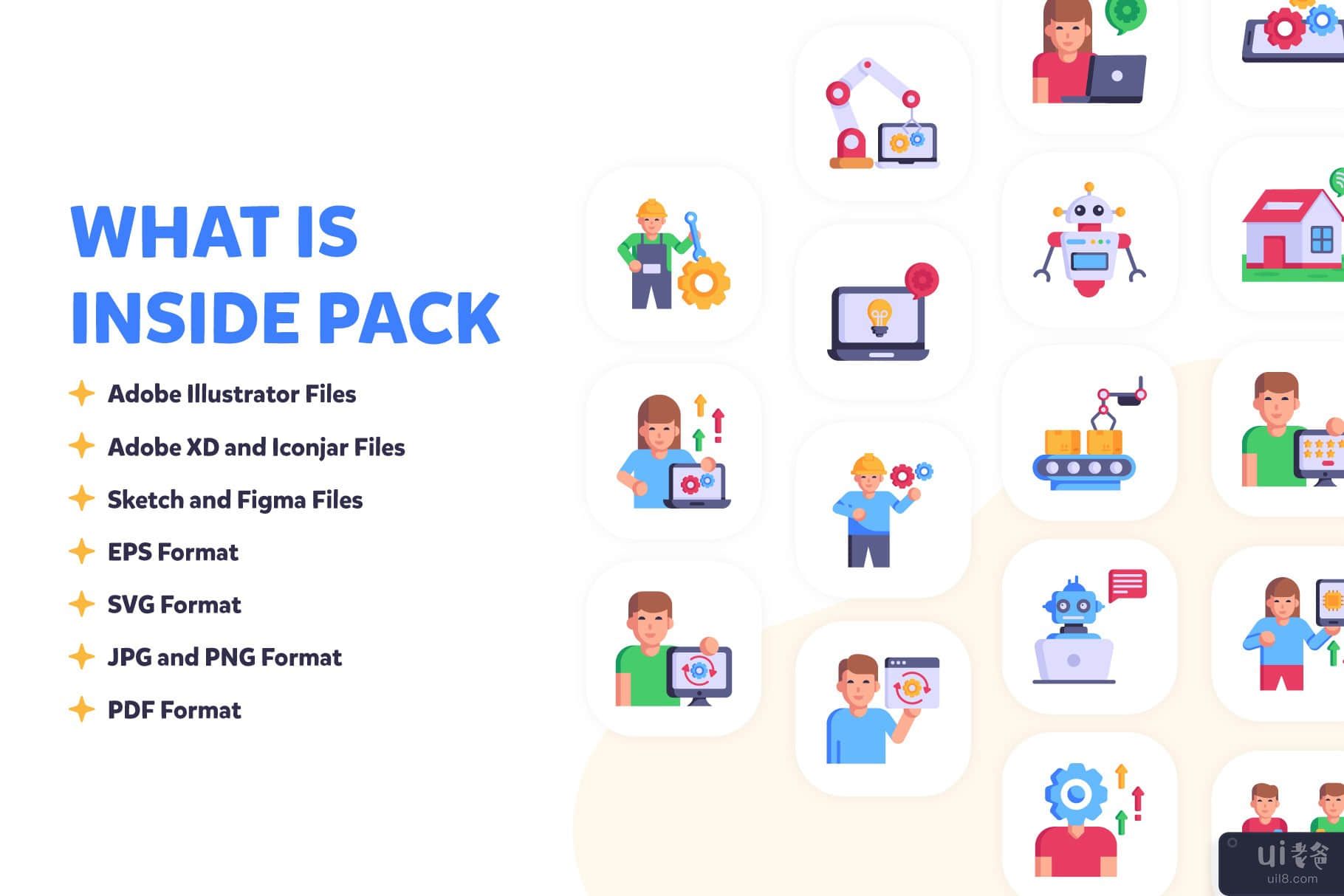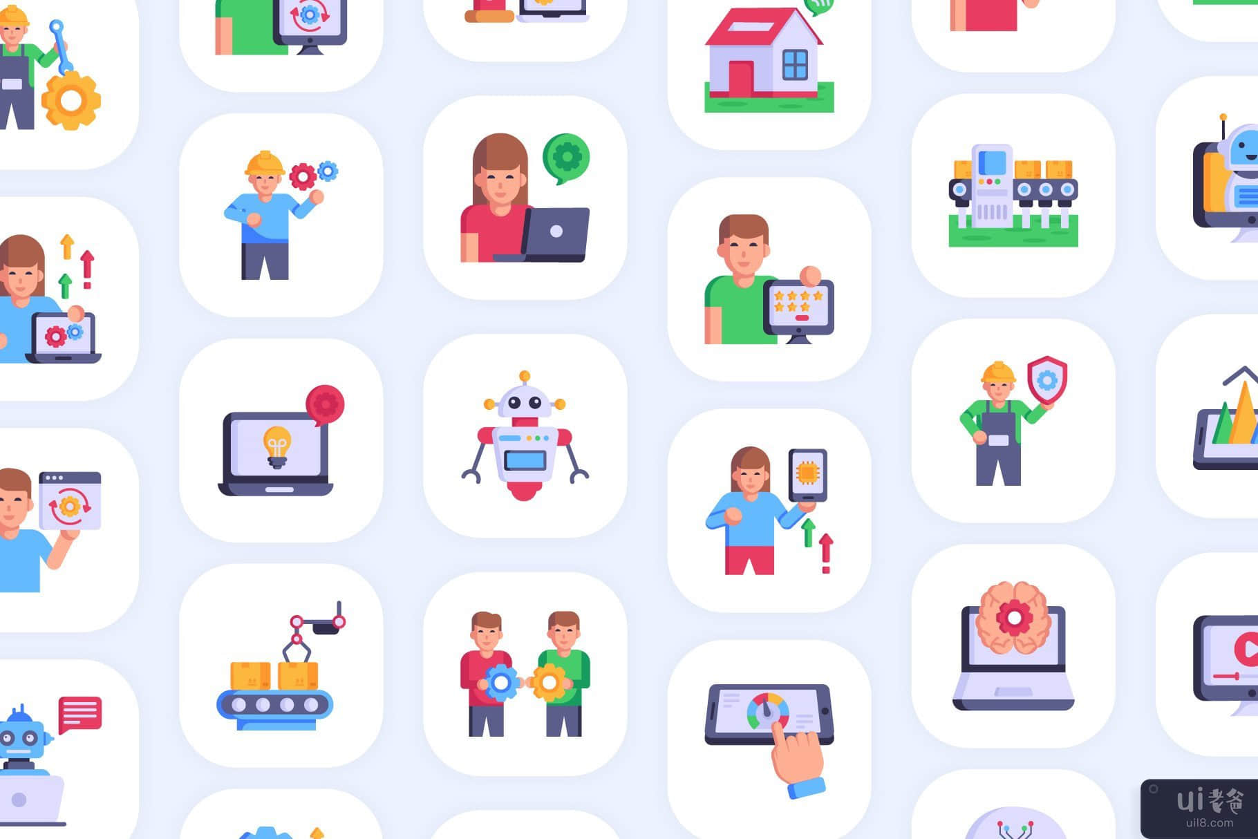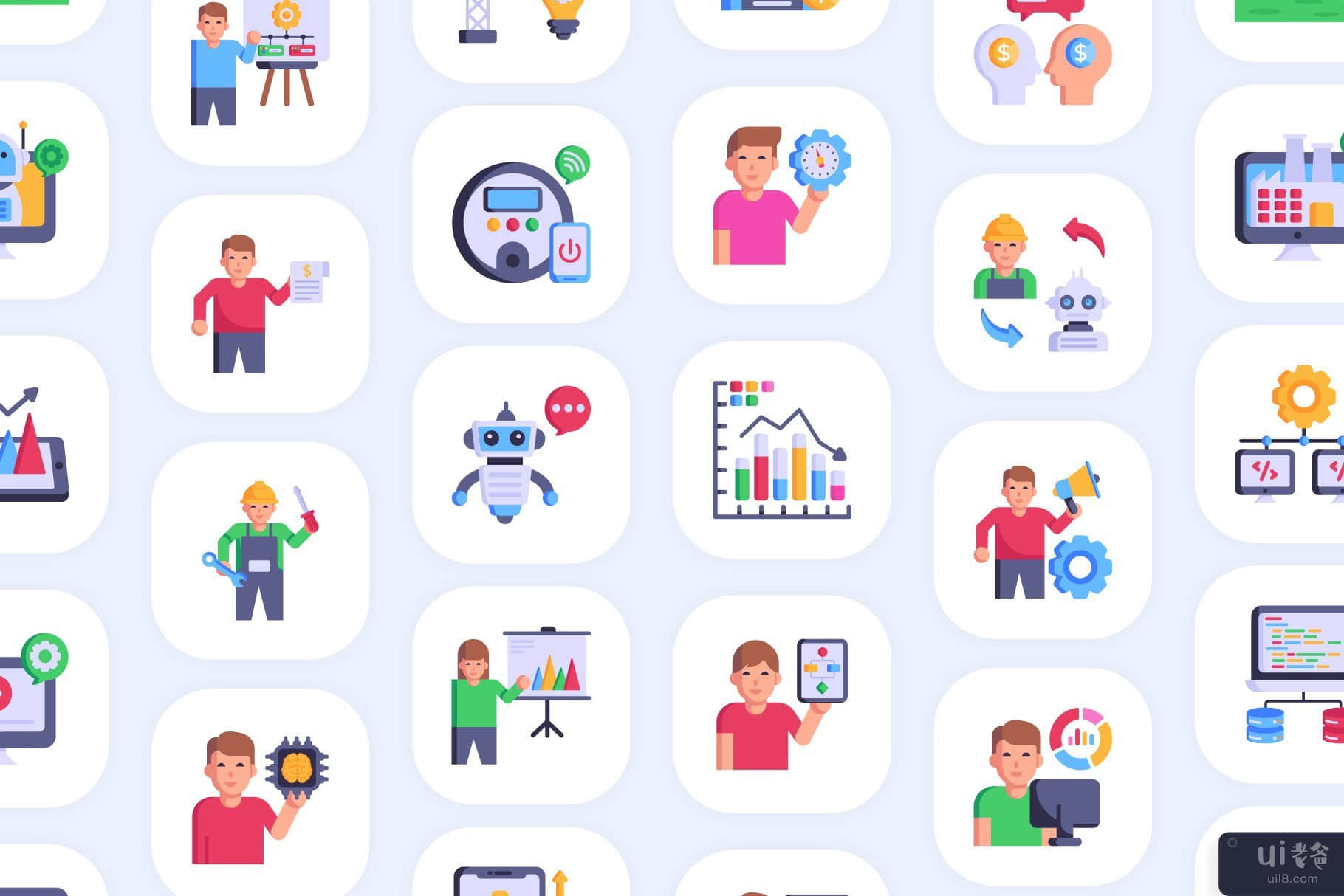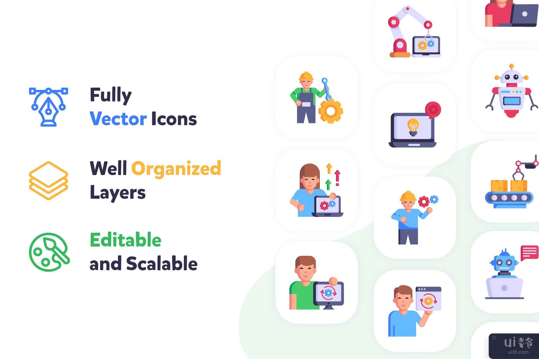 Automation is not a new concept, and we are making our way swiftly to automate various industrial processes. Our collection of automation icons in flat vectors style will help you relate to automation concept in your web and mobile projects and add value to them. You can easily customize these character-based vector icons as per your requirements.