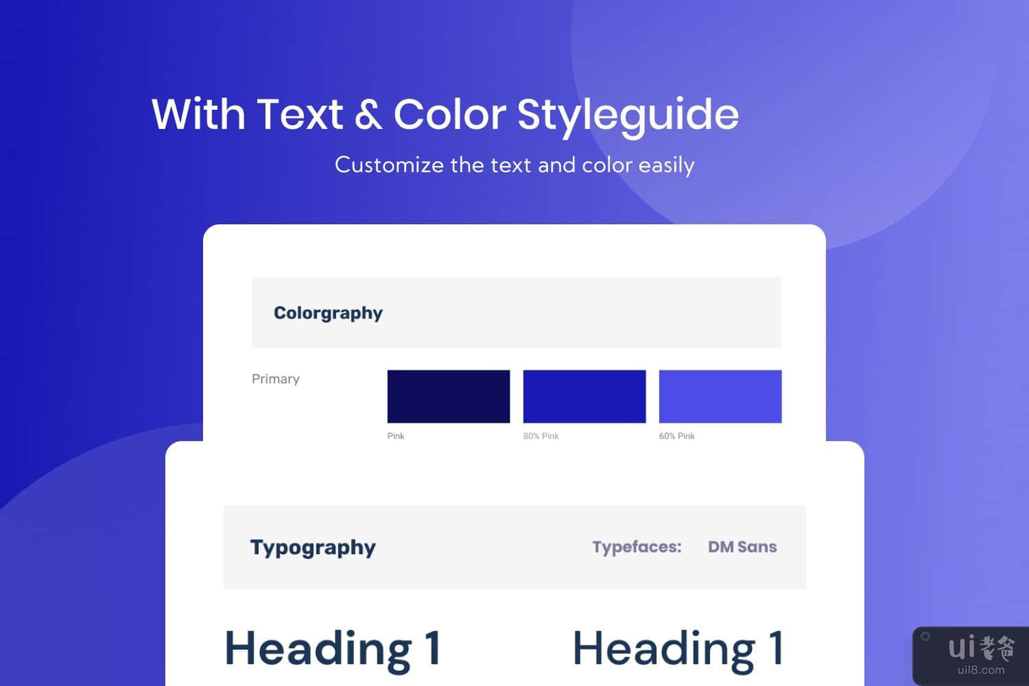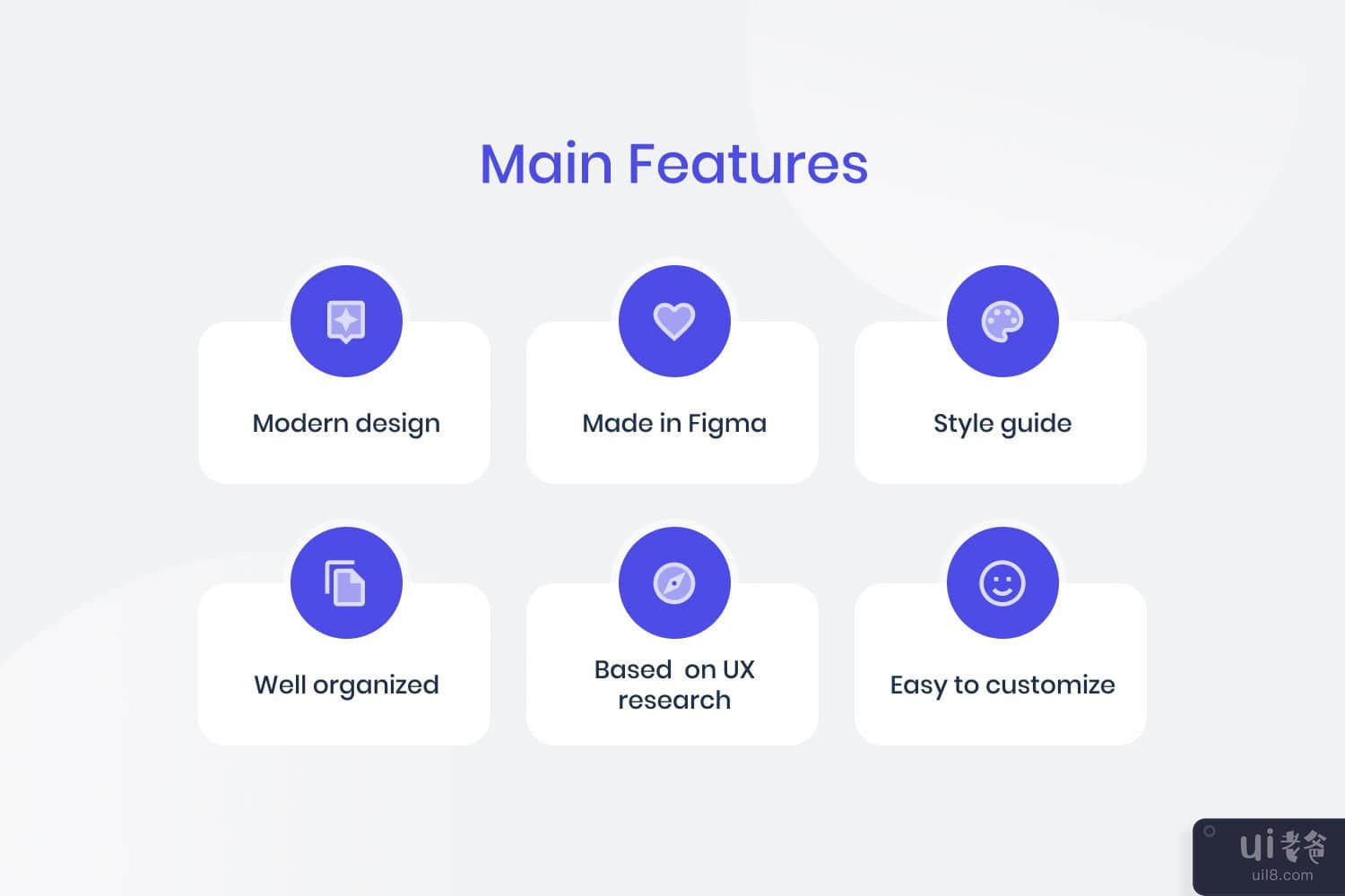 **功能**+ 10 个选定屏幕+ 使用 Google 字体+ 使用免费网络编辑器 Figma 编辑+ 所有组和图层组织整齐