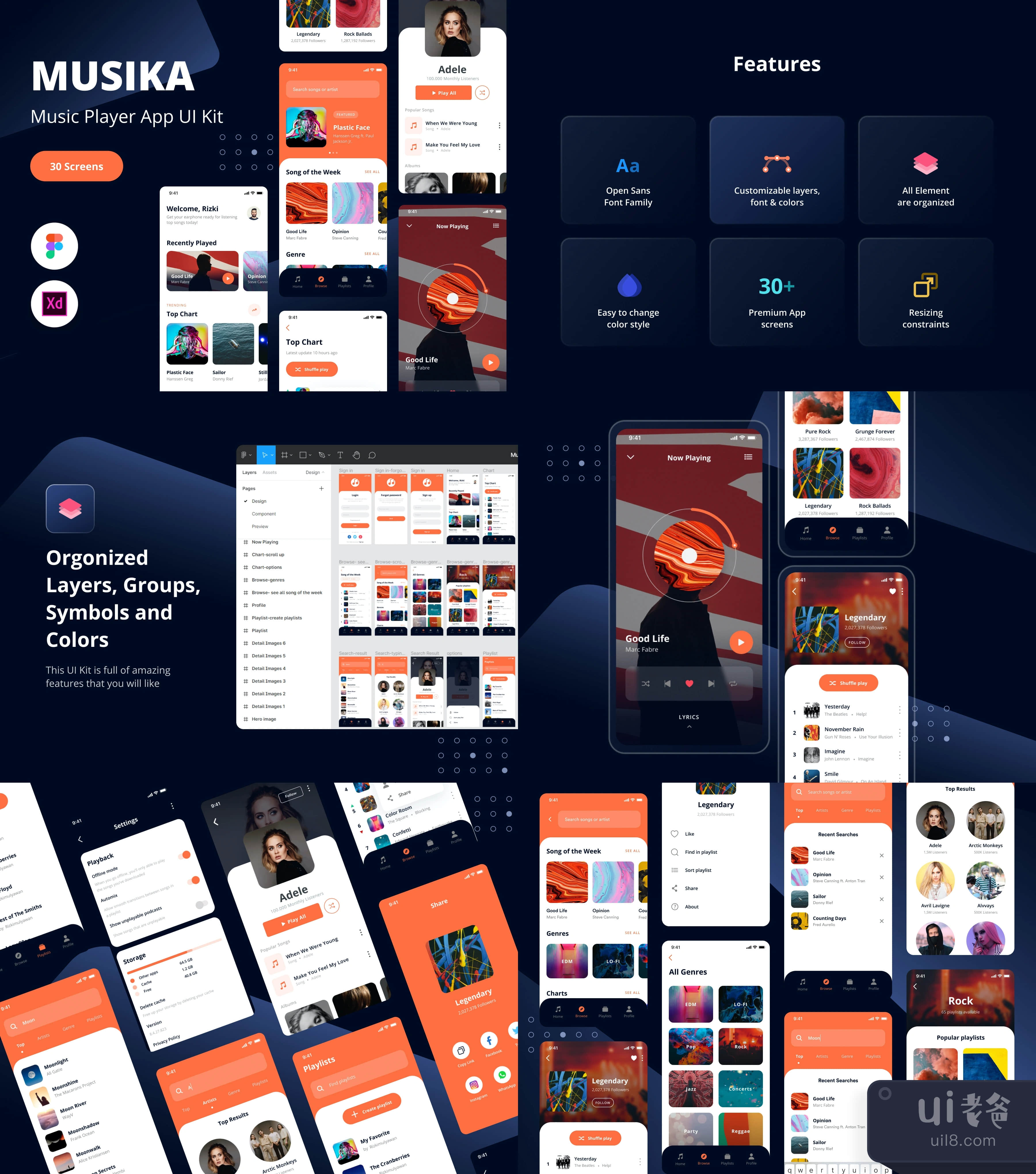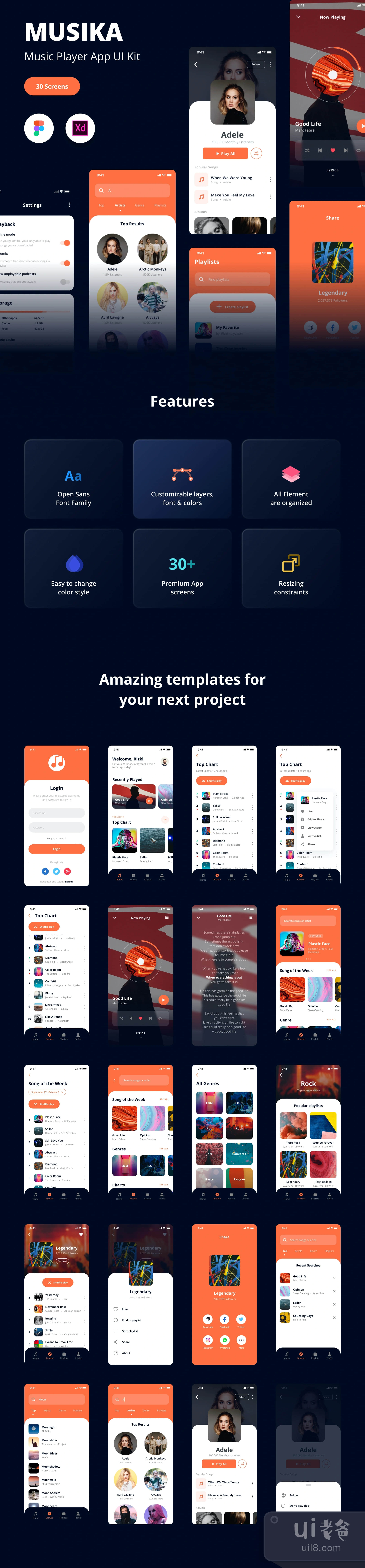 这是我们的新产品,名为Musika。它是音乐播放器应用程序的30个屏幕概念。概念很容易编辑、定制和调整大小,因为有矢量形状和非常好的组织层。