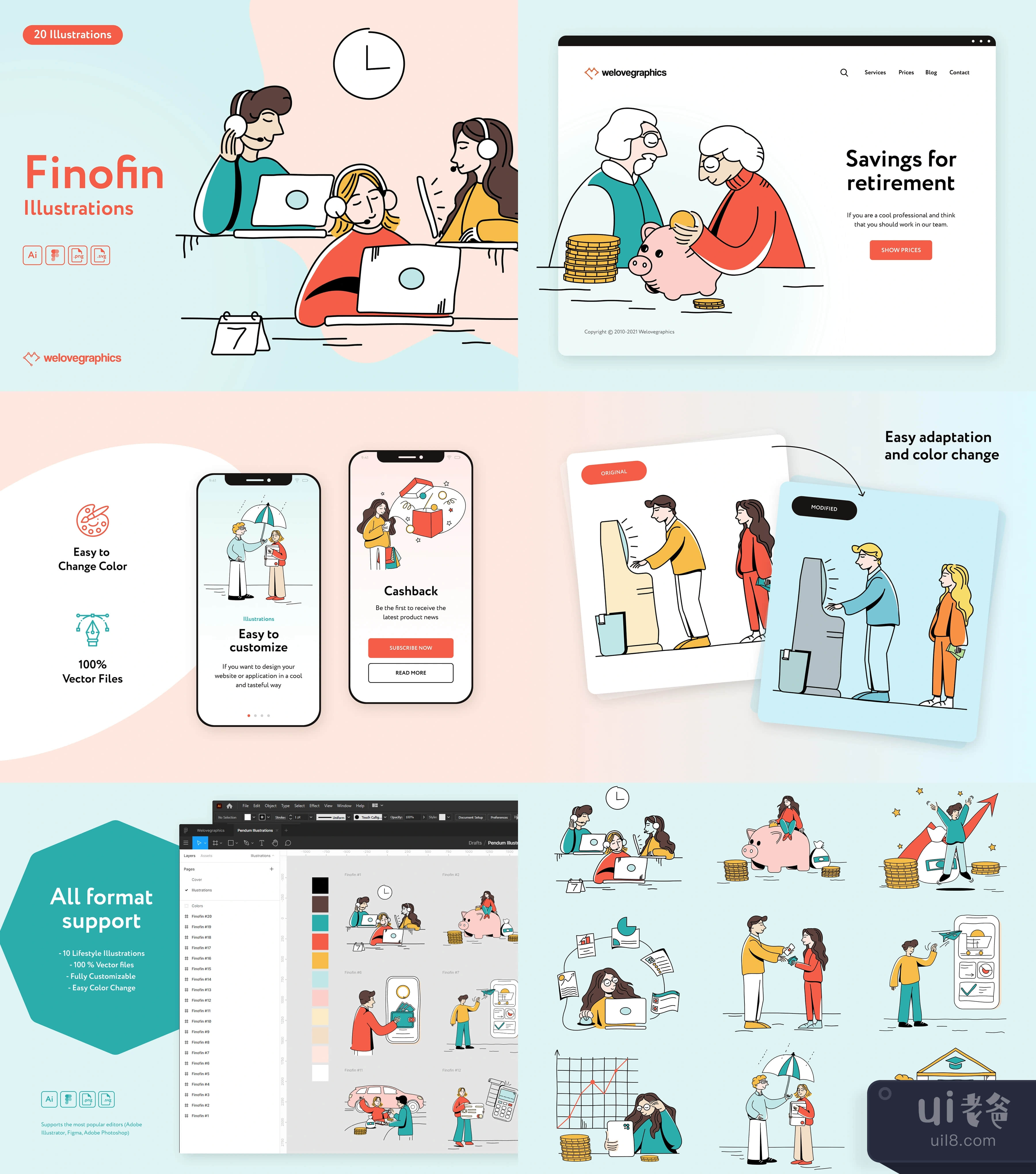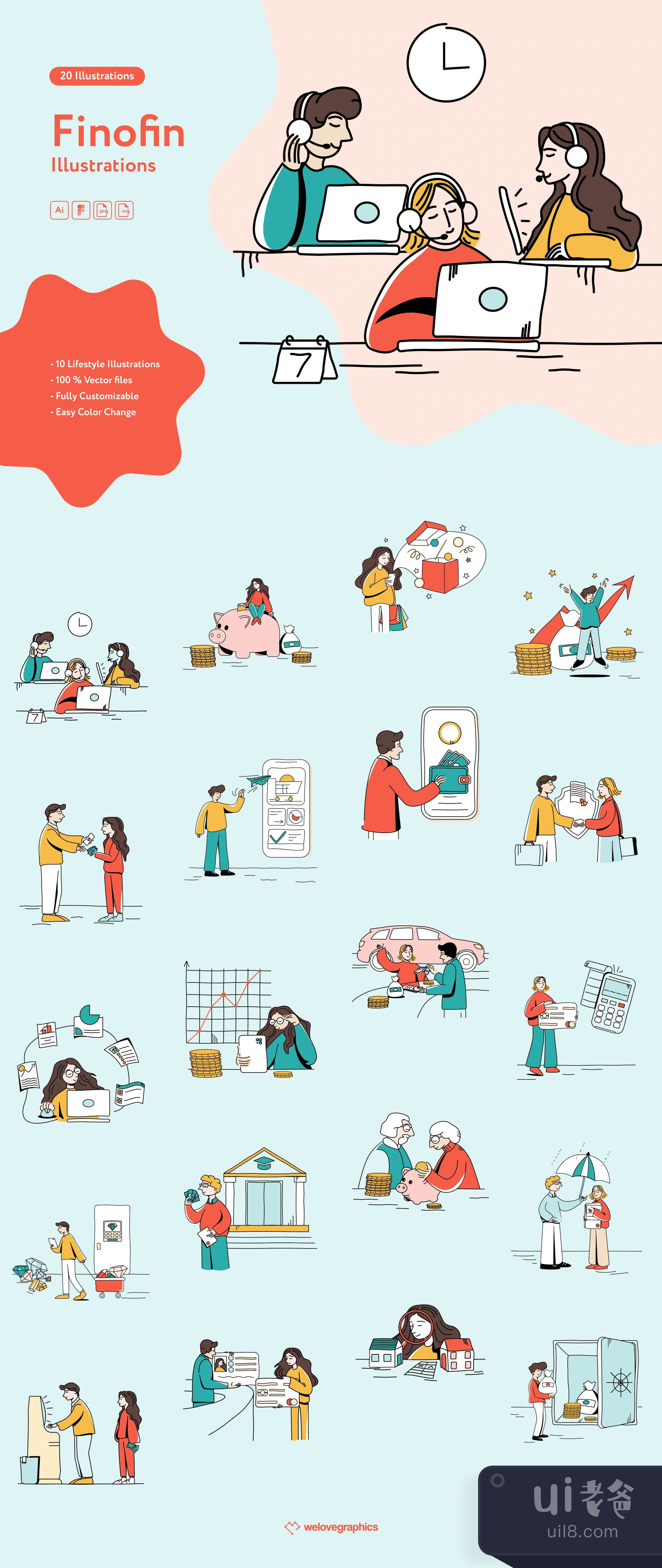20幅以金融为主题的绘画插图。非常适合用于装饰金融、投资、银行和其他金融领域的网站或文章。适应你的任务和项目的插图,你只需要5-10分钟就可以为插图重新着色。所有文件都是结构化的,适合在不同的图形程序中工作。