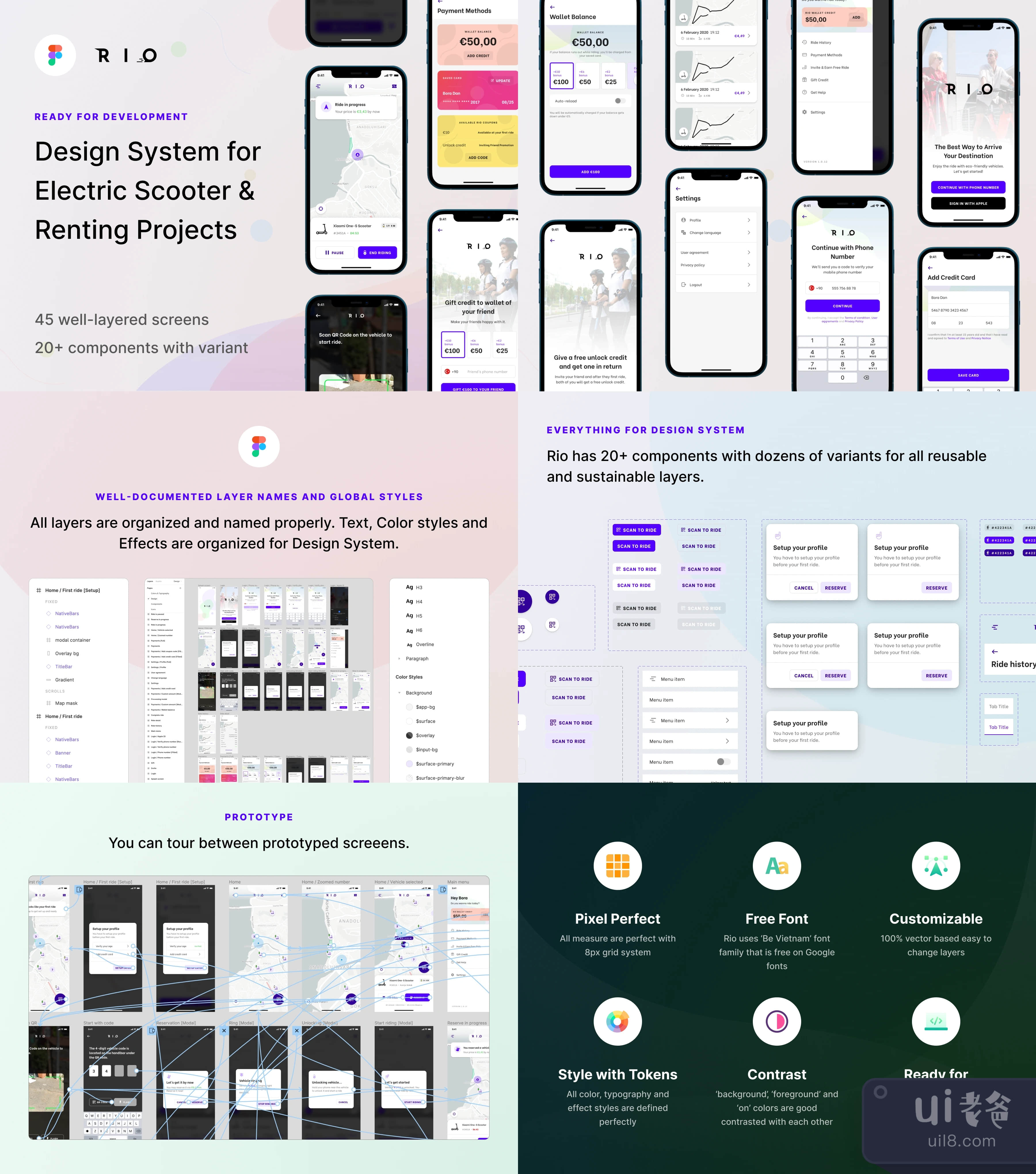 它包含45个精心设计的用户界面屏幕和20多个带有Figma变体的组件。颜色、文字和效果风格都定义得很好,并在项目中使用。Rio还使用了8px网格系统。