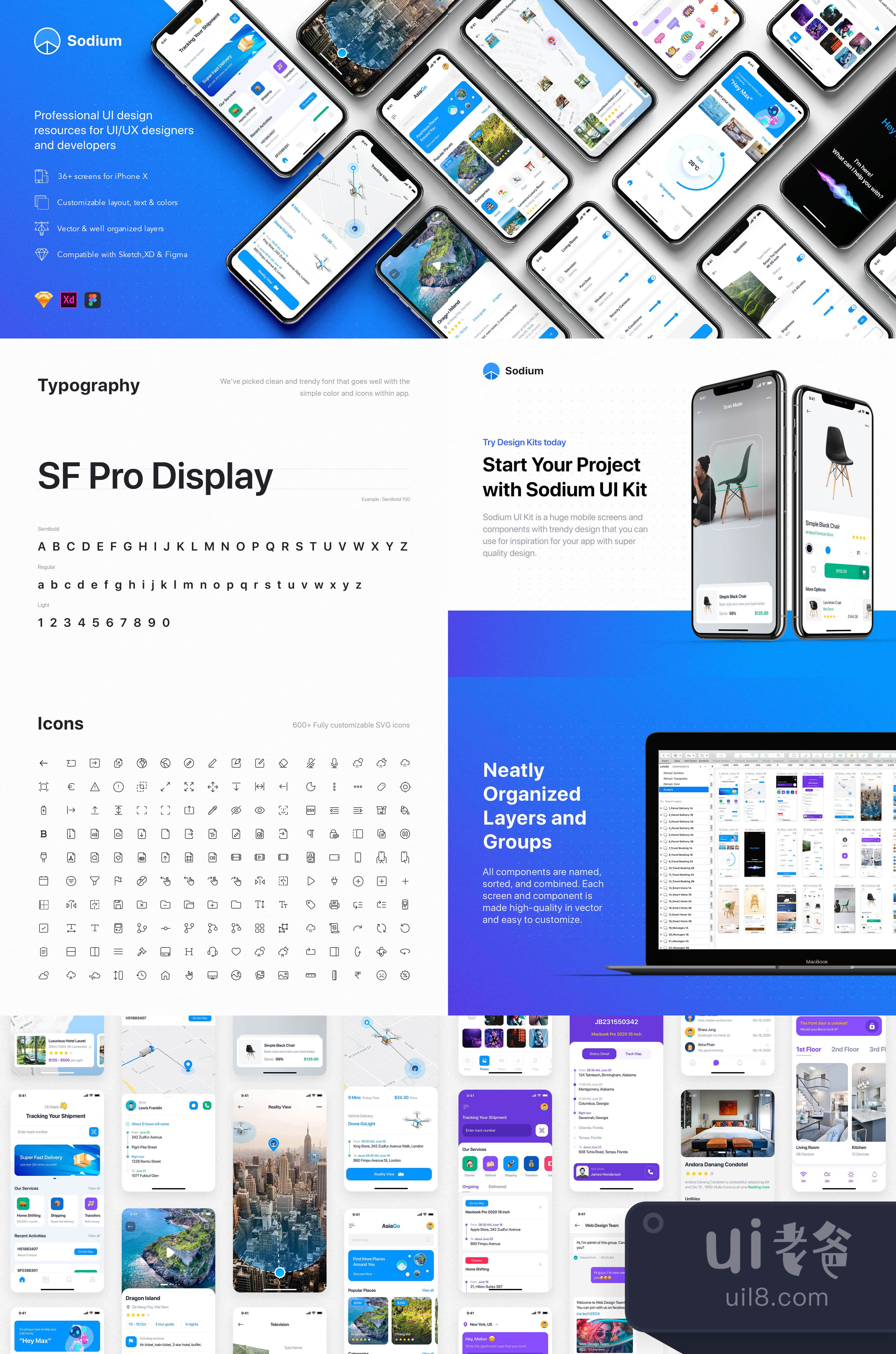 每个屏幕都是完全可定制的,特别容易使用,并在Sketch、XD和FIGMA中精心分层和分组。该文件包括所有最近的功能,如符号、覆盖、调整大小选项、文本和层样式。
