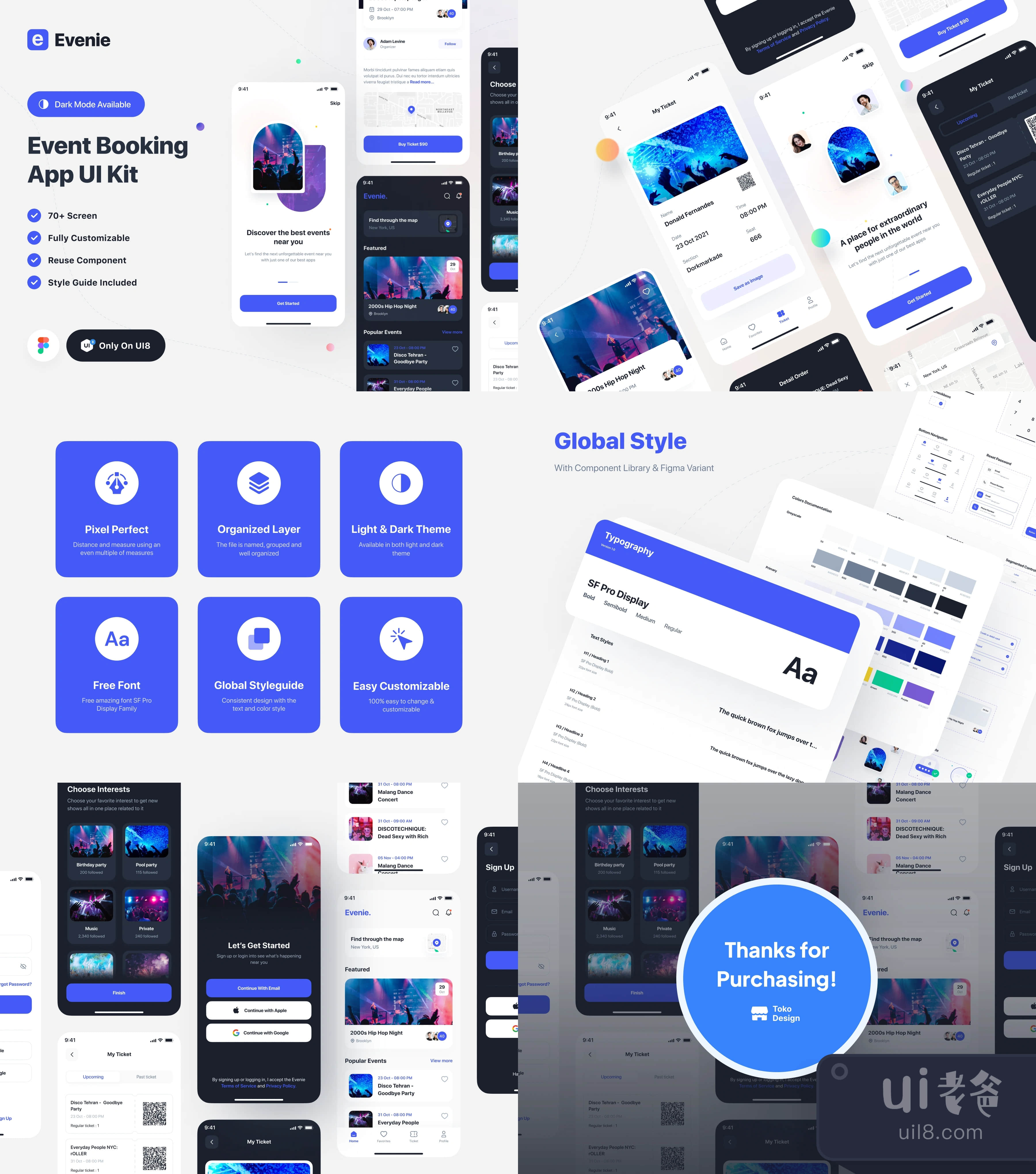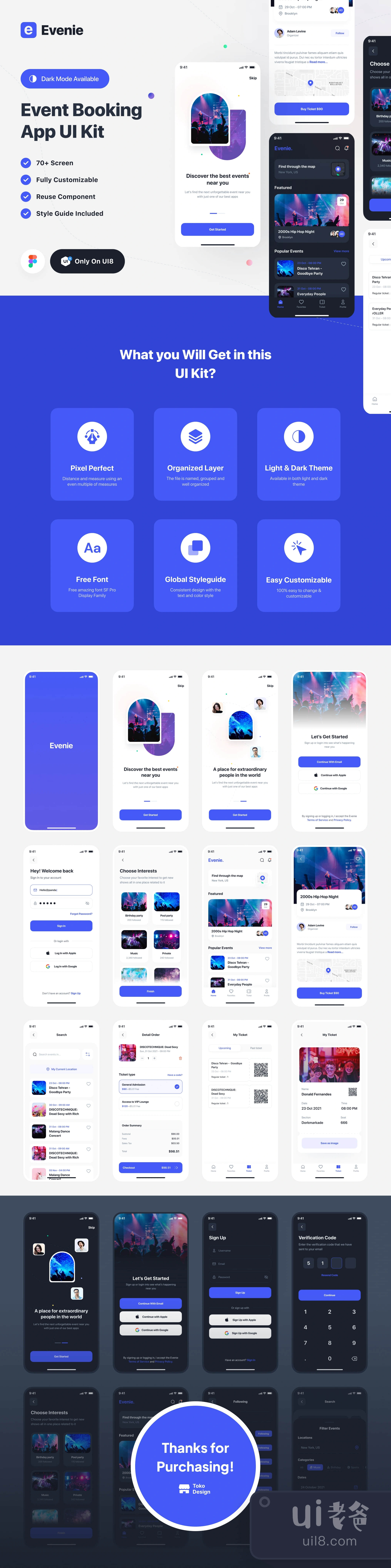 Evenie是一个高级活动预订应用程序UI工具包,由70多个像素完美的屏幕组成,在Figma中易于使用。 该套件很容易根据您的喜好进行完全定制,它利用了Figma的所有功能,包括全局颜色、字体样式、动态组件和变体。有浅色和深色主题。 用这些整洁、干净、现代和出色的设计屏幕开发您的移动应用程序。