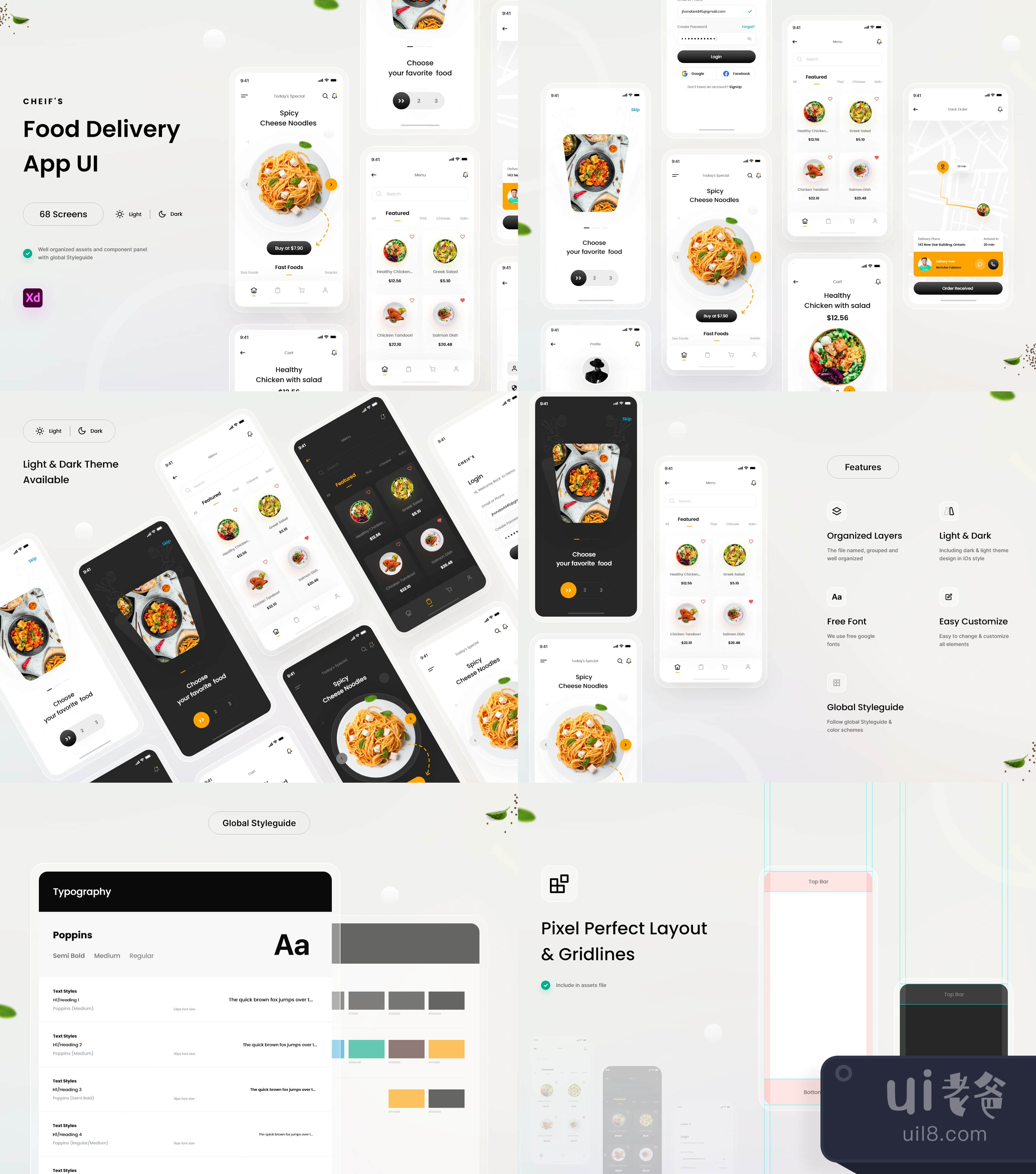 该UI套件由Adobe XD制作,包括全局设计系统和每个元素的完美像素网格,以及组织良好的层和组件。