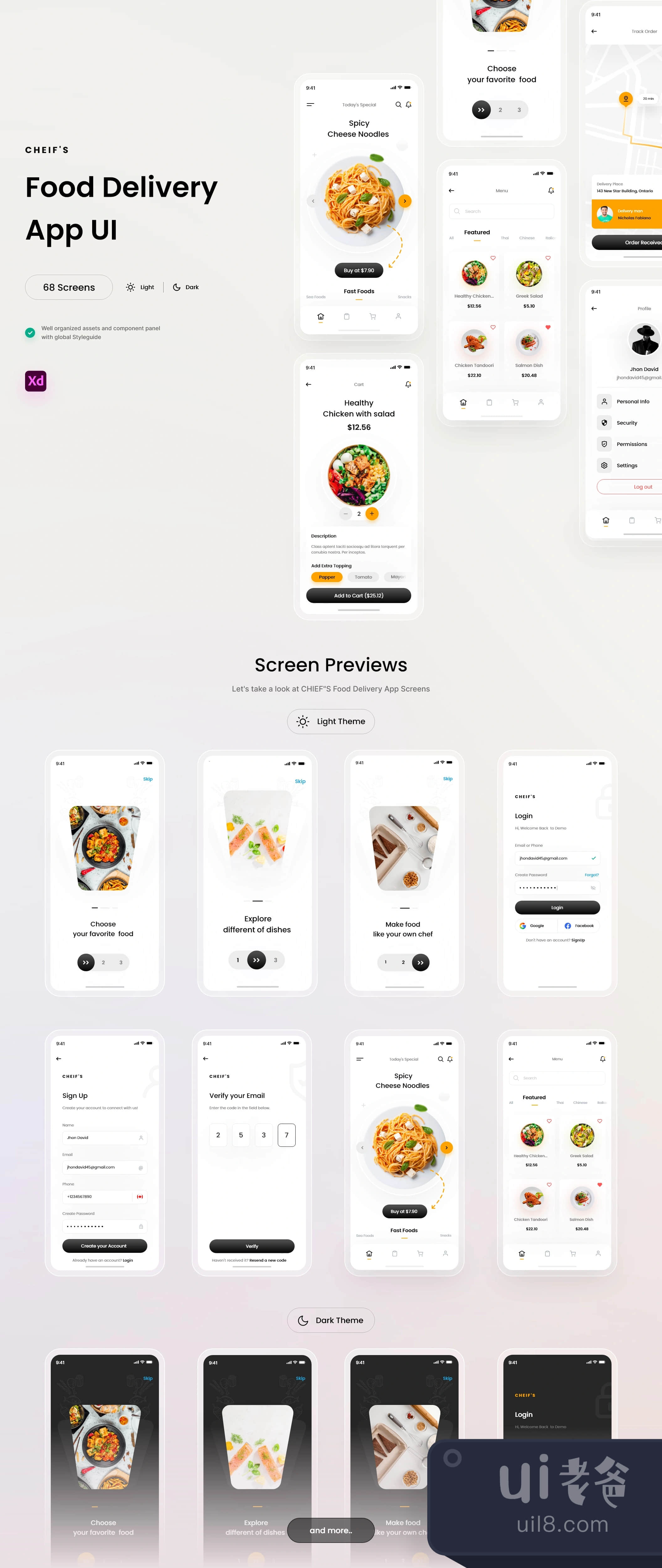 CHIEF "S是一个高级和高质量的食品递送应用程序UI工具包,有68个高质量的屏幕,在Adobe XD中易于使用。有浅色和深色主题。这个应用程序由我们经验丰富的团队设计。