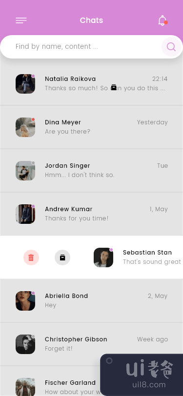 Hello all,Have a good time,Please check out my latest working,Chat detele and remove actions for Massenger app,Hope all guy like it,thanks