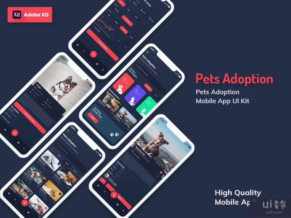 Pets Adoption Mobile App Dark Version (XD)Pets Adoption Mobile App UI kit. High Quality Pets Adoption Mobile App UI Kit Template. We crafted carefully with all possible features related to Pets Adoption Mobile App. It contains 5 screens. Each screen is fully customizable, easy to use and carefully layered and organized in Adobe XD.Main Features of this Template: