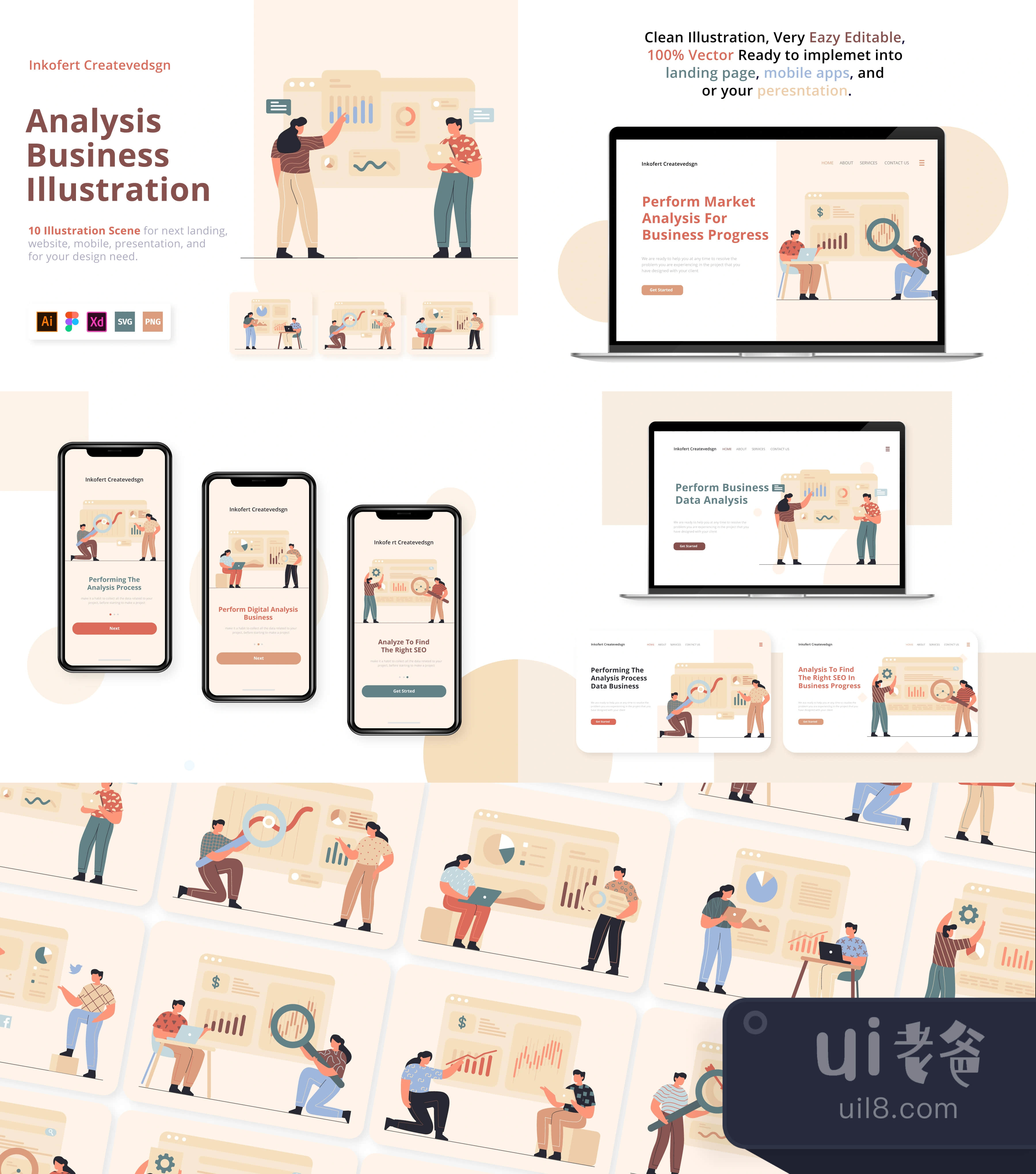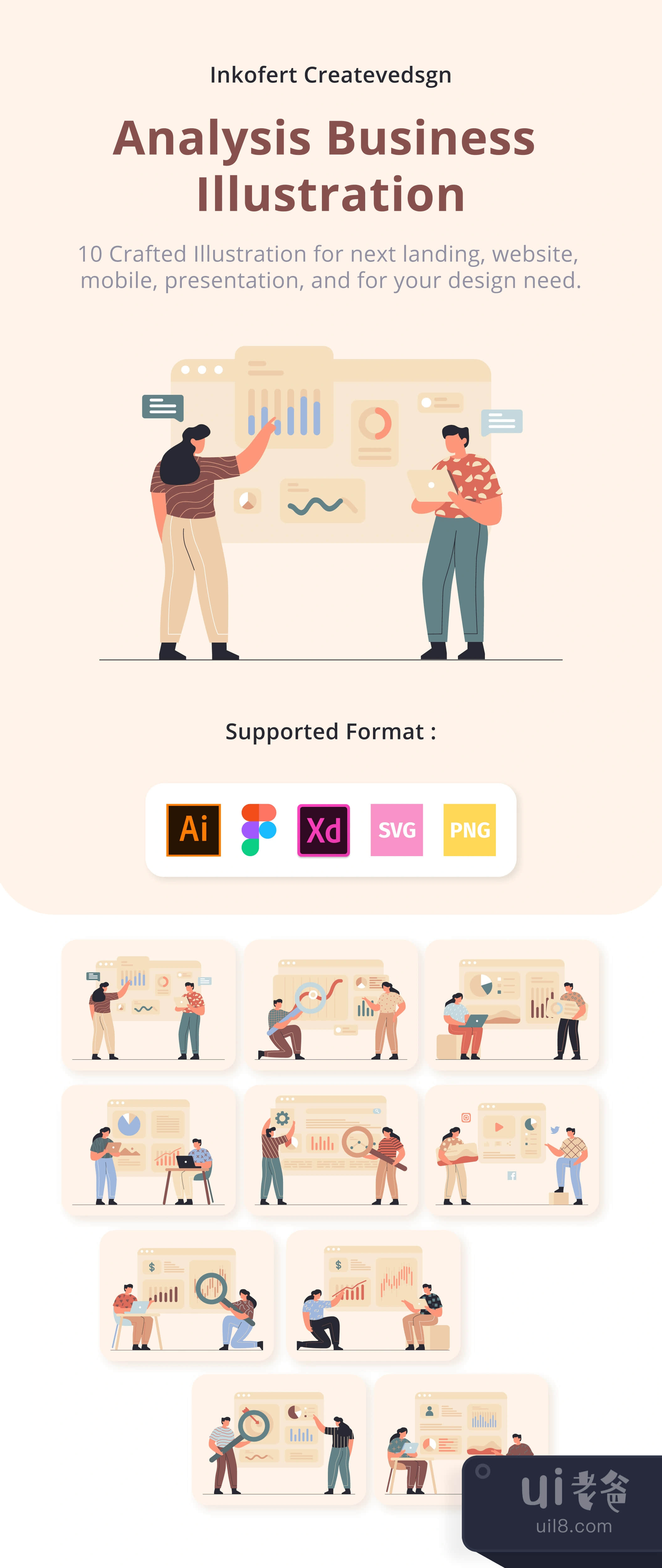 Analytic Business Illsutrations Vol 2 packages for needs in business. This package, you will find 10 illustration scenes available in Illustrator, Figma, Adobe XD, PNG, and SVG.