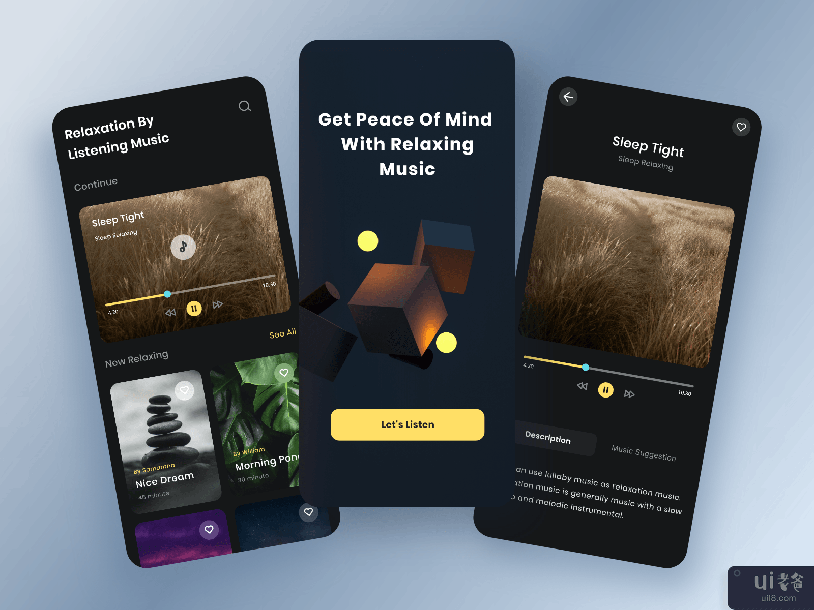 Hello creative people👋Introducing - Sokin Headspace Design App the application relaxes the limbs with a simple concept and with a dark mode theme, so that users are more comfortable when using this application and easy to useFEATURES- Total 3 Screens- Works at Figma and Adobe XD- Pixel perfect UI- Fonts Poppins- 100% EditableSOURCE- Icon iconhub.io- Image unsplashHopefully useful, thank you