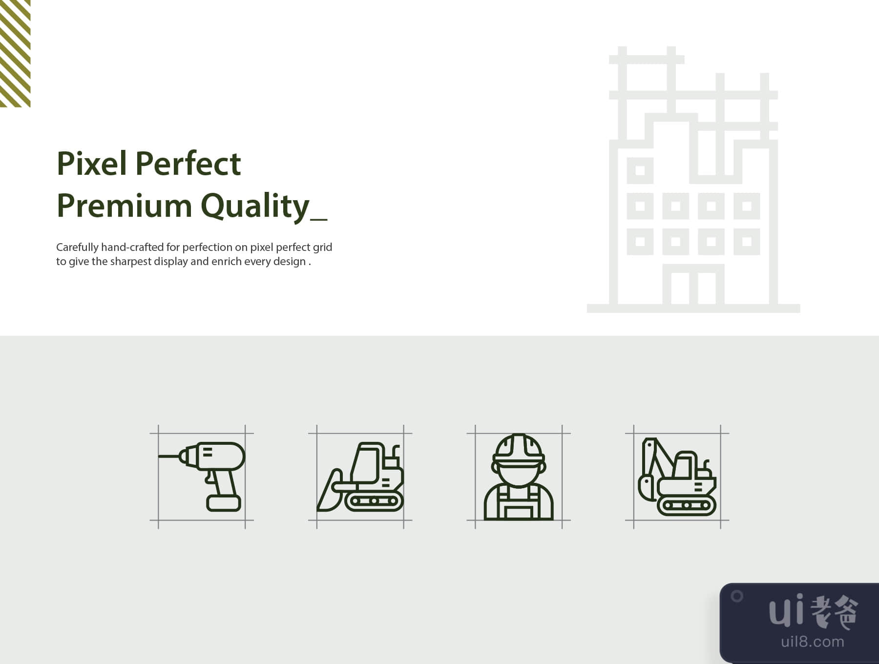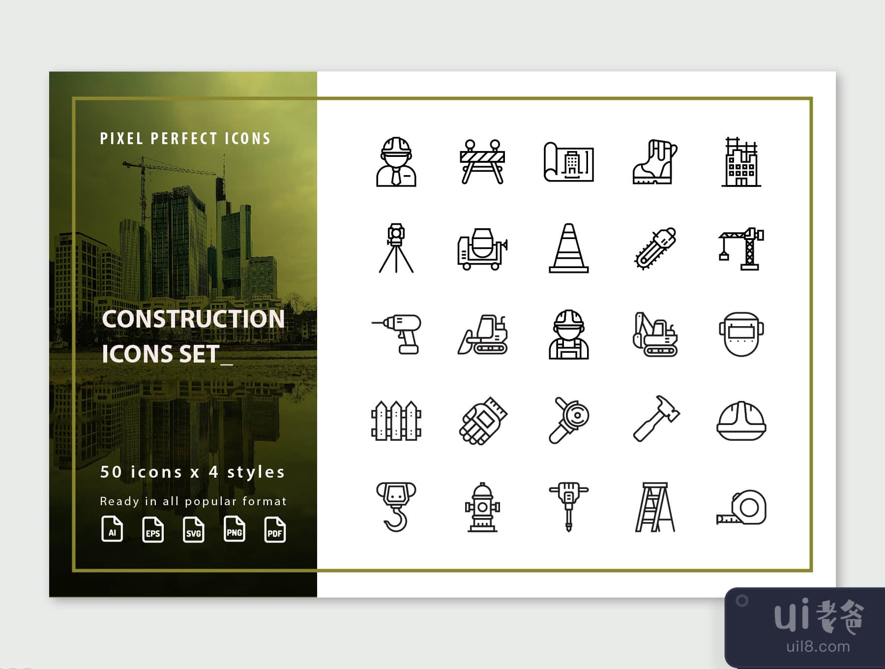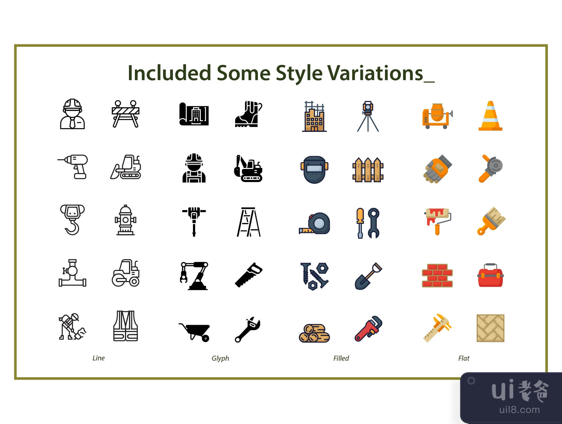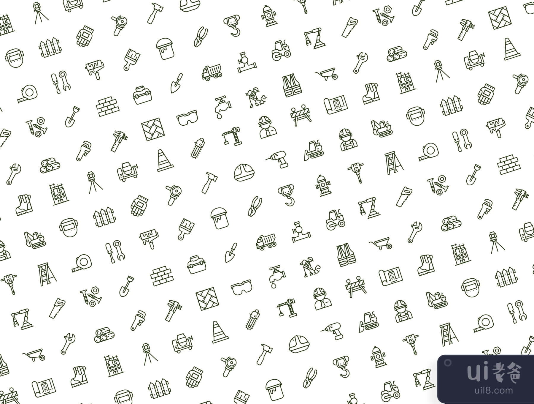在这个包中,包括建筑师,屏障建设,蓝图,靴子,刷油漆,建筑,卡尺,水泥搅拌机,电锯,锥体建筑,起重机,挖掘机,钻机,工程师,挖掘机,水龙头,栅栏,手套,谷歌护眼,研磨机,锤子,舵,钩,消防栓等图标。千斤顶, 梯子, 面罩, 测量, 机械师, 油漆, 镶木, 钳子, 水暖, 机器人手臂, 滚动油漆, 锯子, 螺丝, 铲子, 蒸馏器, 鸠占鹊巢, 工具箱, 抹子, 卡车, 施工中的标志, 保护背心, 墙砖, 手推车, 木伐, 扳手, 扳手。
