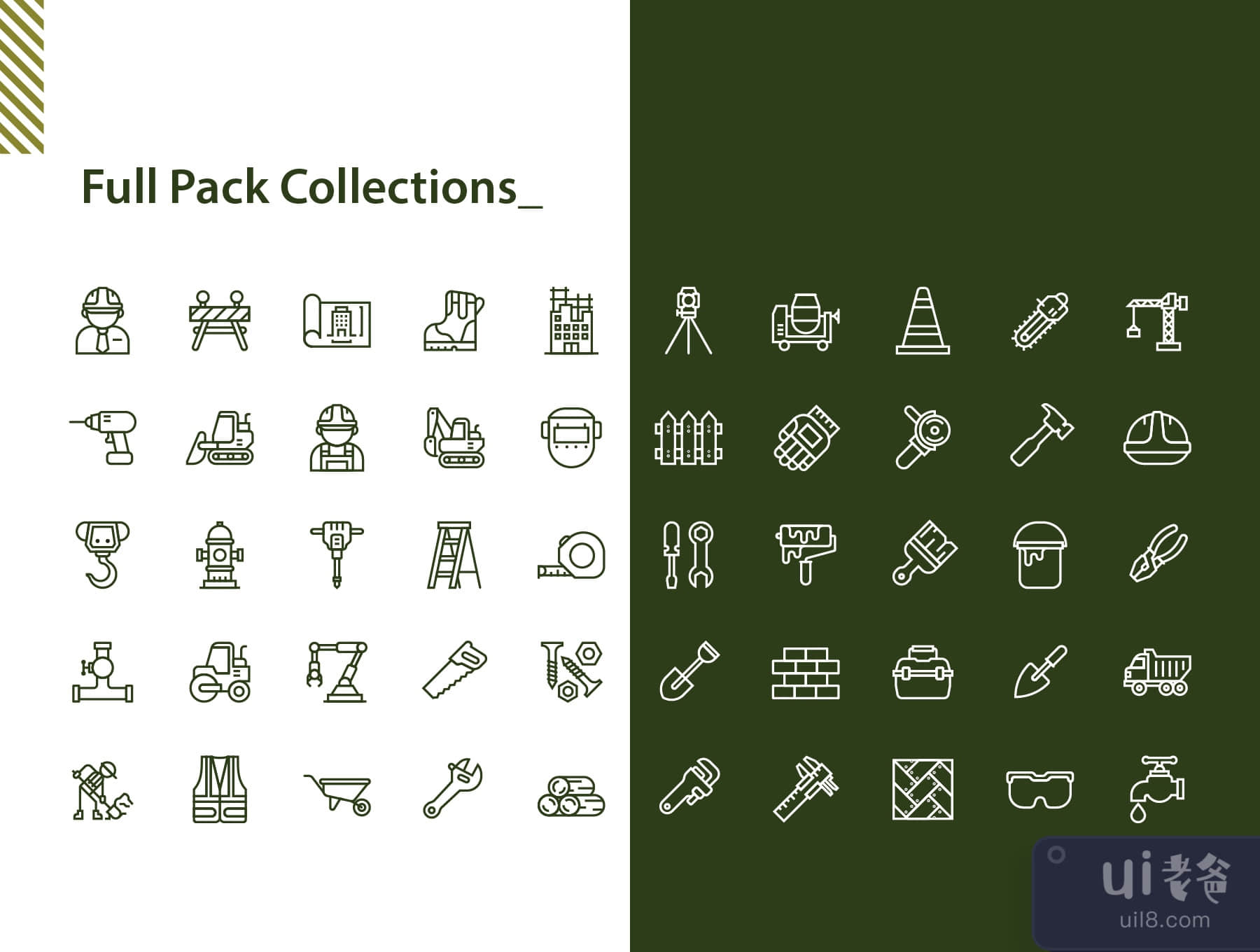 In this pack includes icons of Architect, Barrier construction, Blueprint, Boots, Brush Paint, Building, Caliper, Cement mixer, Chainsaw, Cone construction, Crane, Digger, Driller, Engineer, Excavator, Faucet, Fence, Gloves, Google eye protector, Grinder, Hammer, Helm, Hook, Hydrant, Jackhammer, Ladder, Mask protector, Measuring, Mechanic, Paint, Parquet, Pliers, Plumbing, Robotic arm, Roll Paint, Saw, Screw, Shovel, Steamroller, Theodolite, Toolbox, Trowel, Truck, Under construction sign, Vest protect, Wall brick, Wheelbarrow, Wooden logging, Wrench pipe, Wrench.