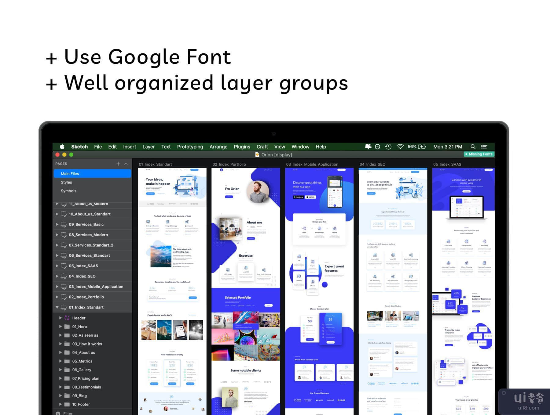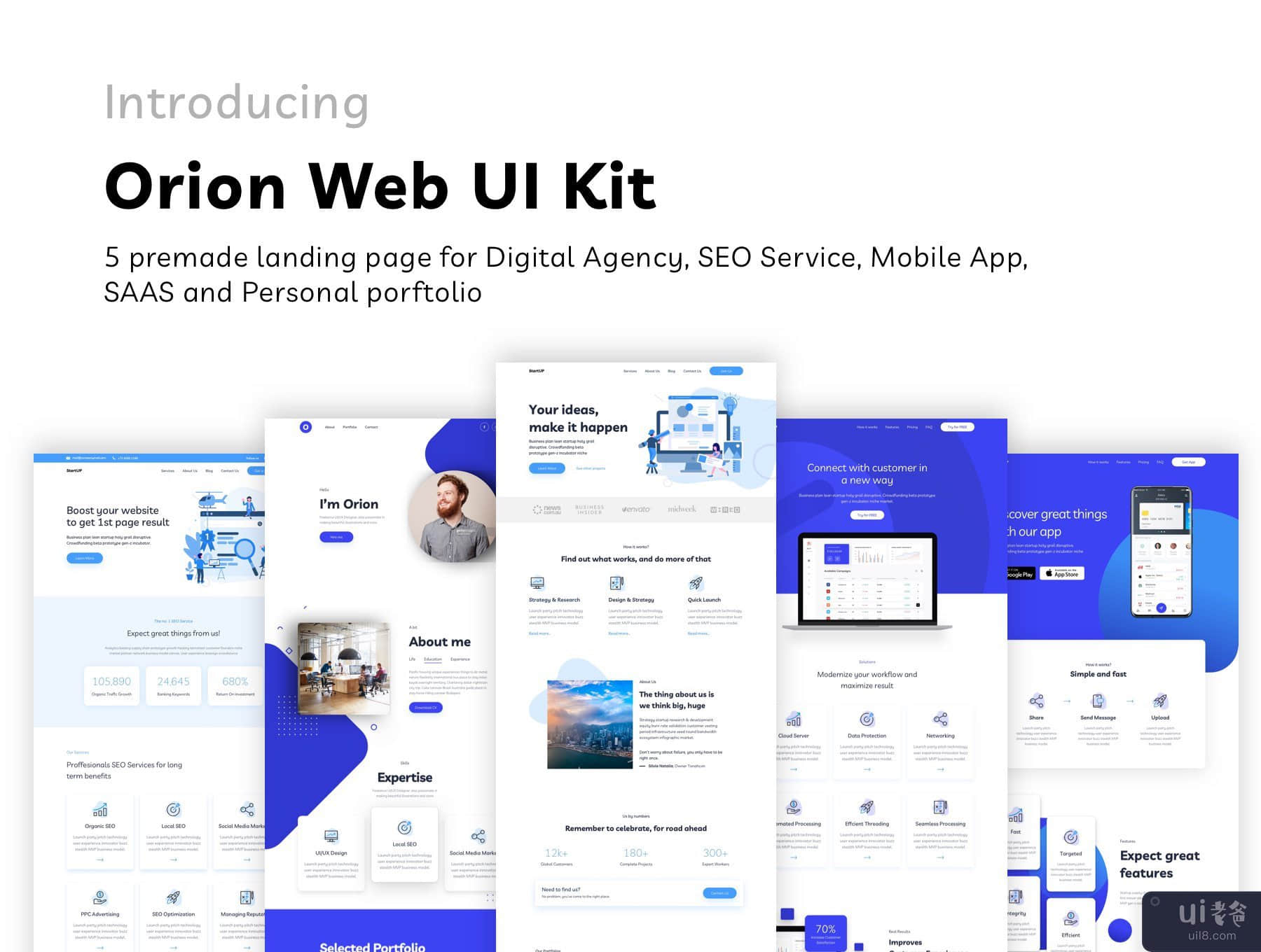 Orion Web UI Kit is modernly crafted sketch template which can be used for Digital Agency, SEO Service, Mobile App Landing, SAAS Landing, also Personal Portfolio Project.