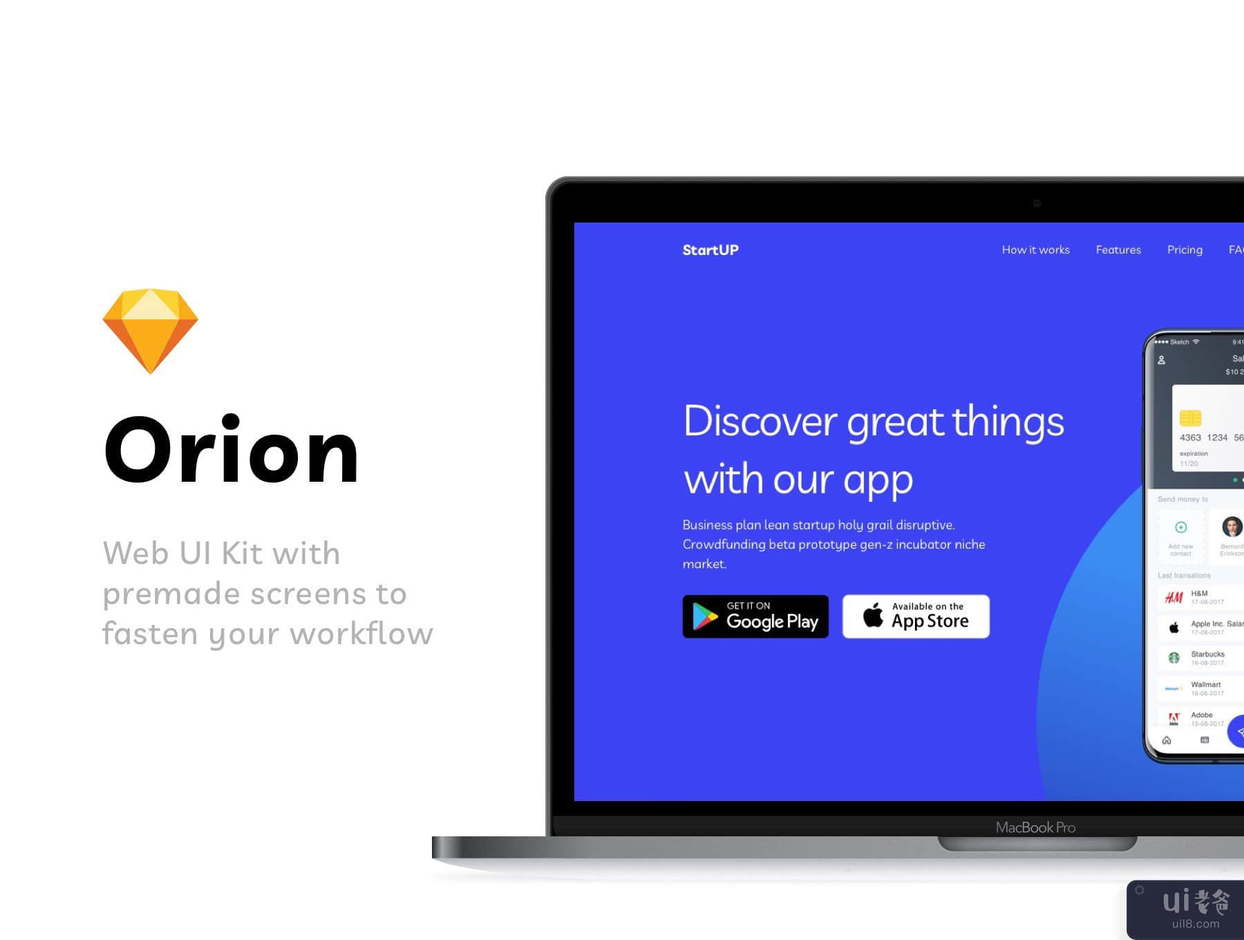 Orion Web UI Kit 是现代制作的草图模板,可用于数字代理、SEO 服务、移动应用程序登陆、SAAS 登陆以及个人投资组合项目。