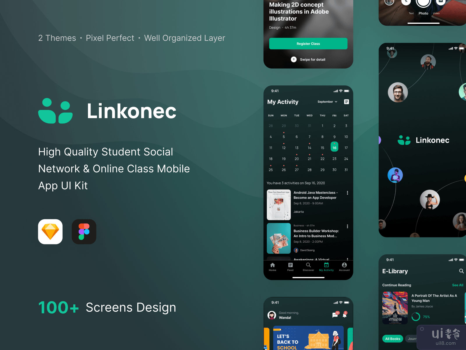 这是 Linkonec,一个用于学生社交网络、社交媒体和在线课堂平台的 UI 工具包。此移动 UI 工具包不仅旨在帮助学生与朋友和同学联系,还可以将他们与导师或老师联系起来。