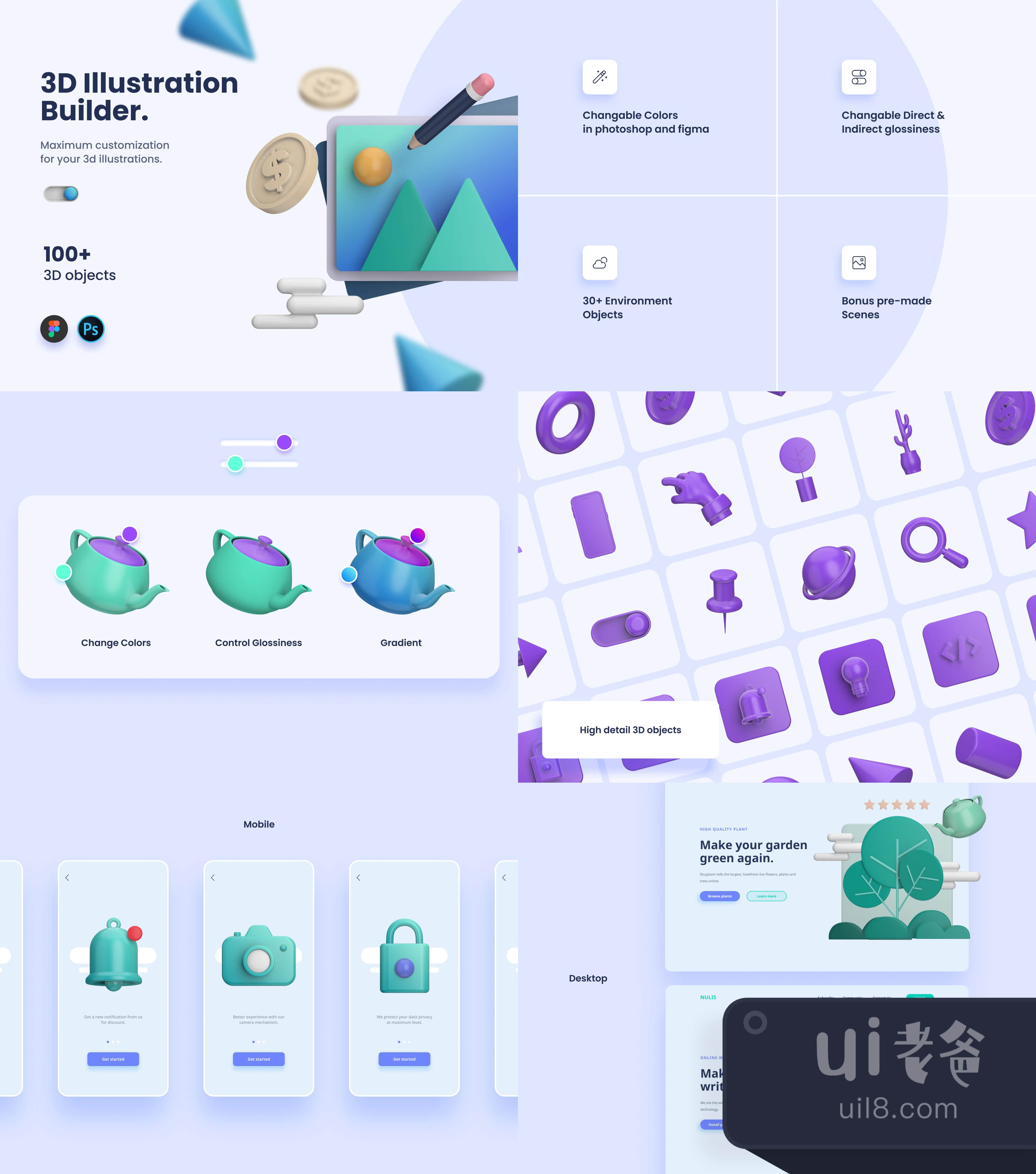 在这个软件包中,你会发现100多个独特的3D元素,你可以在figma或photoshop中通过精心组织的图层和组轻松改变颜色和光泽度。