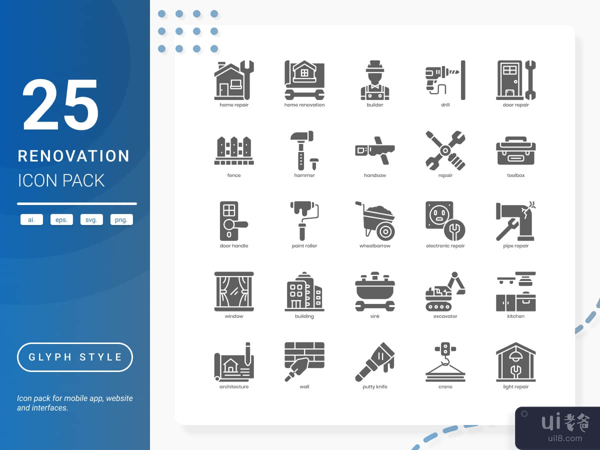 Renovation Icon Pack is composed of 25 stylish icons that showcase the most popular services and ideas. It's perfect for website design, mobile applications, presentations, analytical reports, infographics, or website templates.