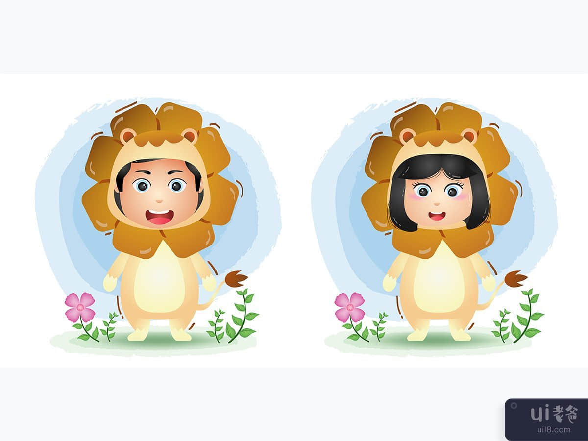 穿着狮子服装的可爱情侣(cute couple using the lions costume)