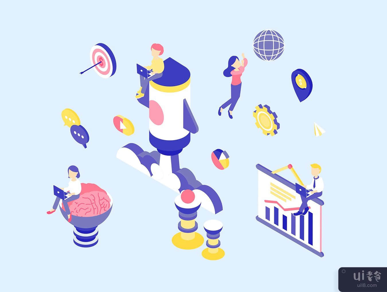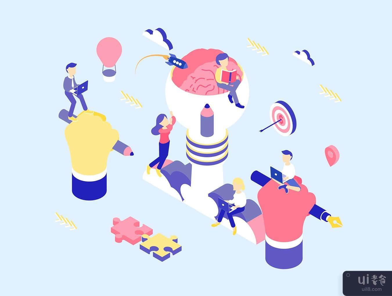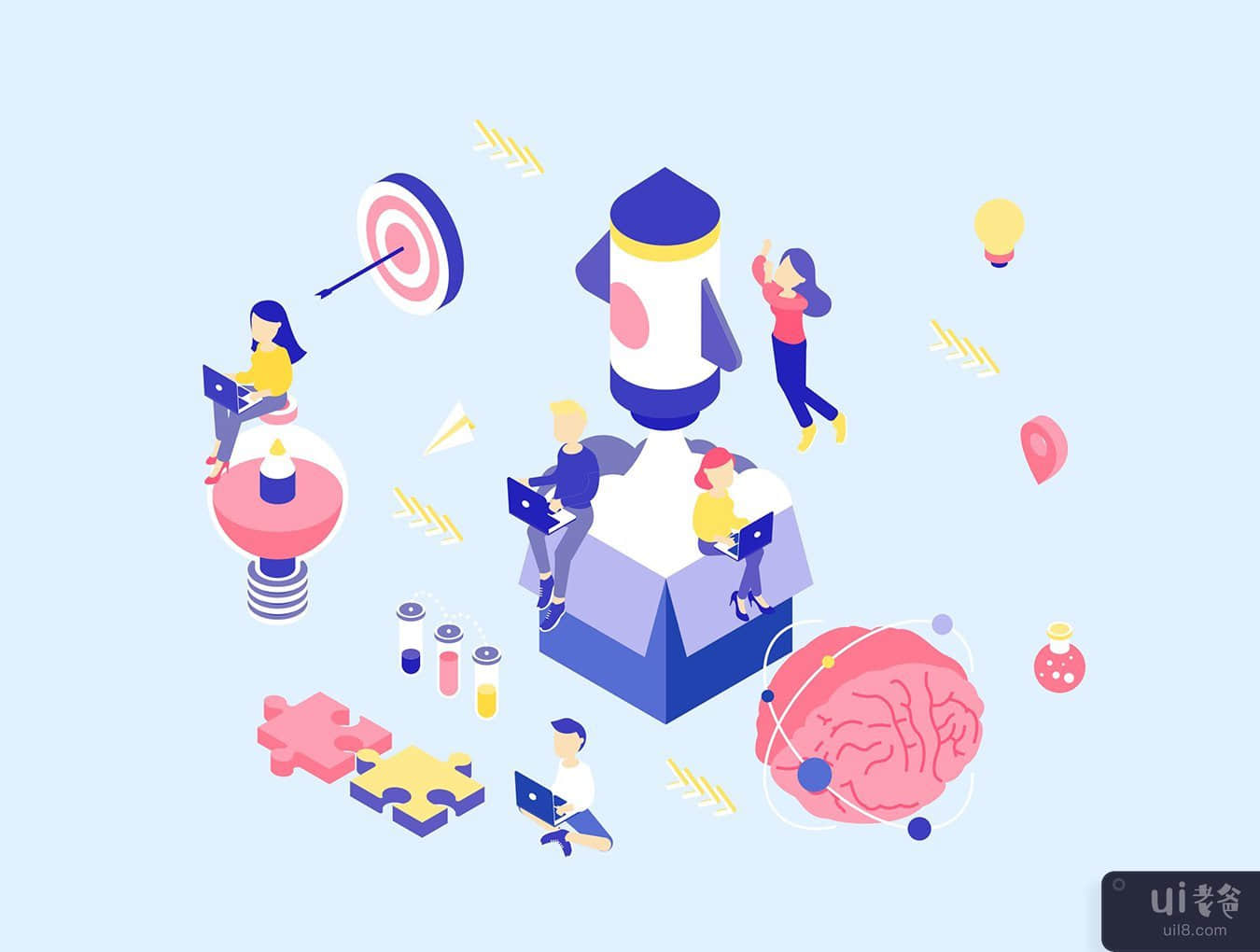 包括 8 个等距插图概念。 它旨在为主题提供图形: Brading、创意、创意过程、领导力、创业、团队合作、网页设计、网页开发。所有元素都是 100% 矢量并与 Illustrator 兼容。如果您有不同的要求,请联系我:angelbijob@gmail.com