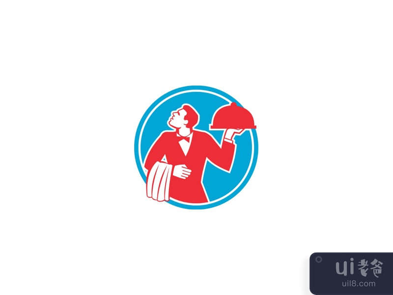 Illustration of a butler waiter serving food in a platter looking to the side viewed from front set inside circle on isolated background done in retro style.