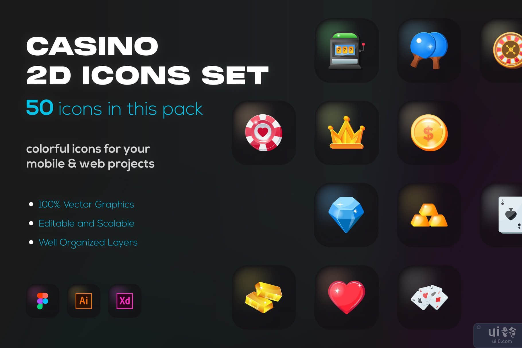 50 个很酷的赌场平面图标(50 Cool Casino Flat Icons)