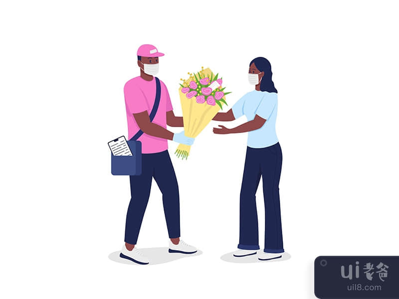 African american courier in face mask gives woman flowers flat color vector detailed characters. Safe delivery during epidemic isolated cartoon illustration for web graphic design and animation