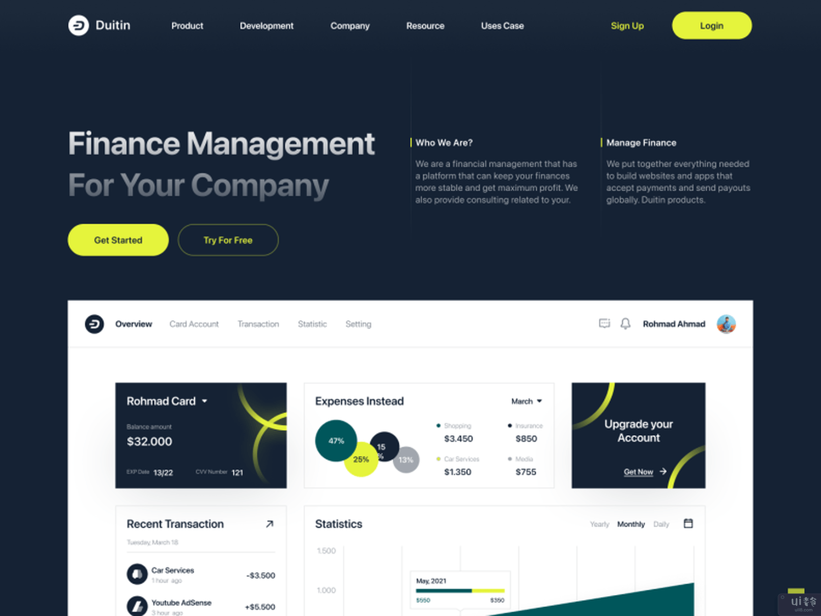 Hi dribbble, This is my exploration of Duitin - Finance Management Landing Page.