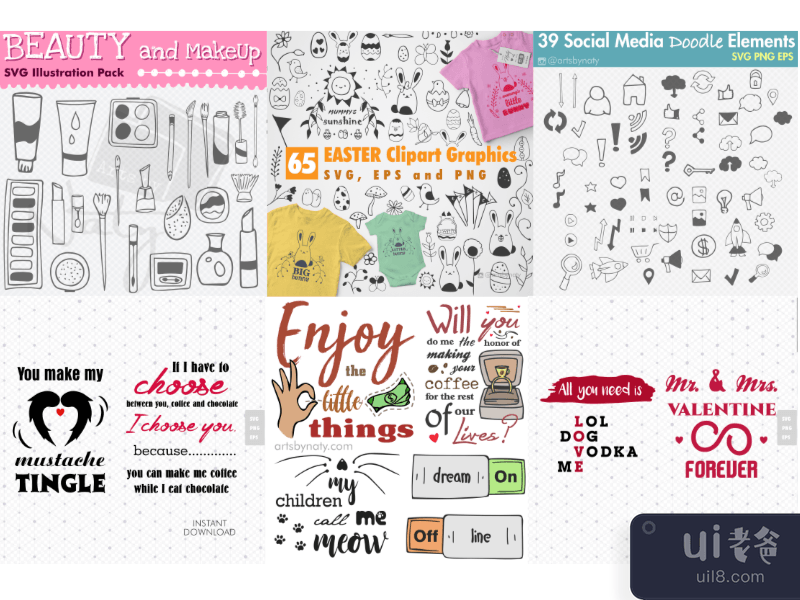 在这个大的 SVG 包中,您会找到插图、引用、元素等等。其中一些是全彩色的,而另一些你可以自己使用,没有任何颜色或颜色。您还可以将这些设计打印为可打印的或将它们应用在杯子、T 恤、贴纸等上。