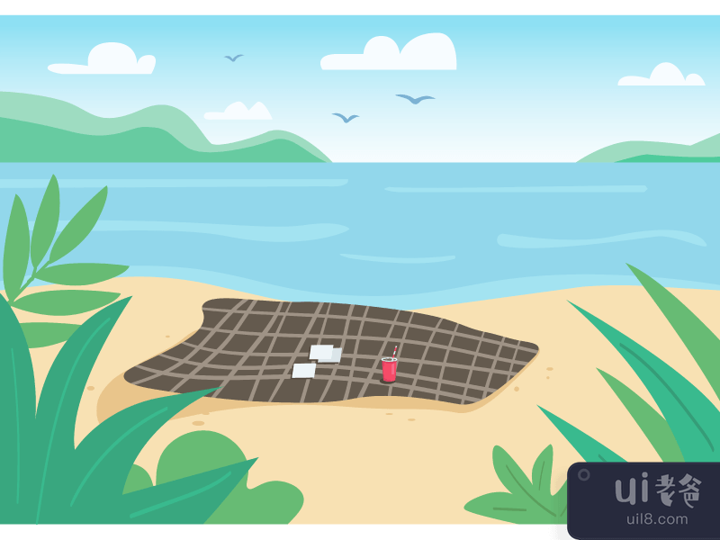 野生海滩上的毯子平面彩色矢量图解(Blanket on wild beach flat color vector illustration)