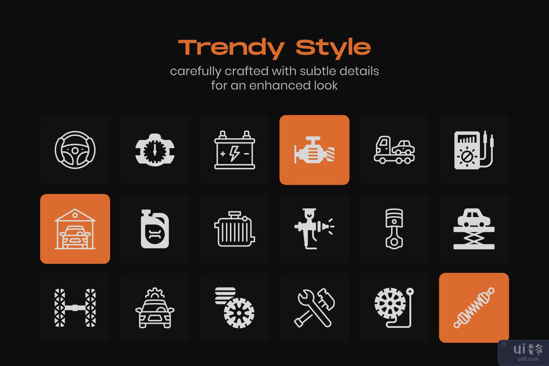 为了您的方便,我们提供现代线性样式的与汽车维修服务相关的紧凑型产品。设置有广泛的相关图标,如交通灯、路锥、汽车千斤顶等等。这个包非常适合需要汽车服务和维护的地方。