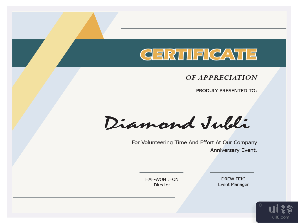 当前位置: 首页模板正文 感谢证书(CERTIFICATE OF APPRECIATION) 模板 3年前 0 4.6K 12 收藏 -中文- 感谢证书 -英文- CERTIFICATE OF APPRECIATION 声明:本站所有文章,如无特殊说明或标注,均为本站原创发布。任何个人或组织,在未征得本站同意时,禁止复制、盗用、采集、发布本站内容到任何网站、书籍等各类媒体平台。如若本站内容侵犯了原著者的合法权益,可联系我们进行处理。appreciationcertificate感谢证书 HardikHirpara青铜用户 收藏 海报 链接