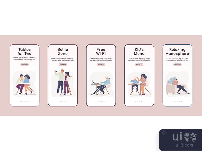 城市咖啡馆服务载入移动应用屏幕平面矢量模板。在咖啡馆里放松。使用字符演练网站步骤。 UX、UI、GUI 智能手机卡通界面、案例打印套装。