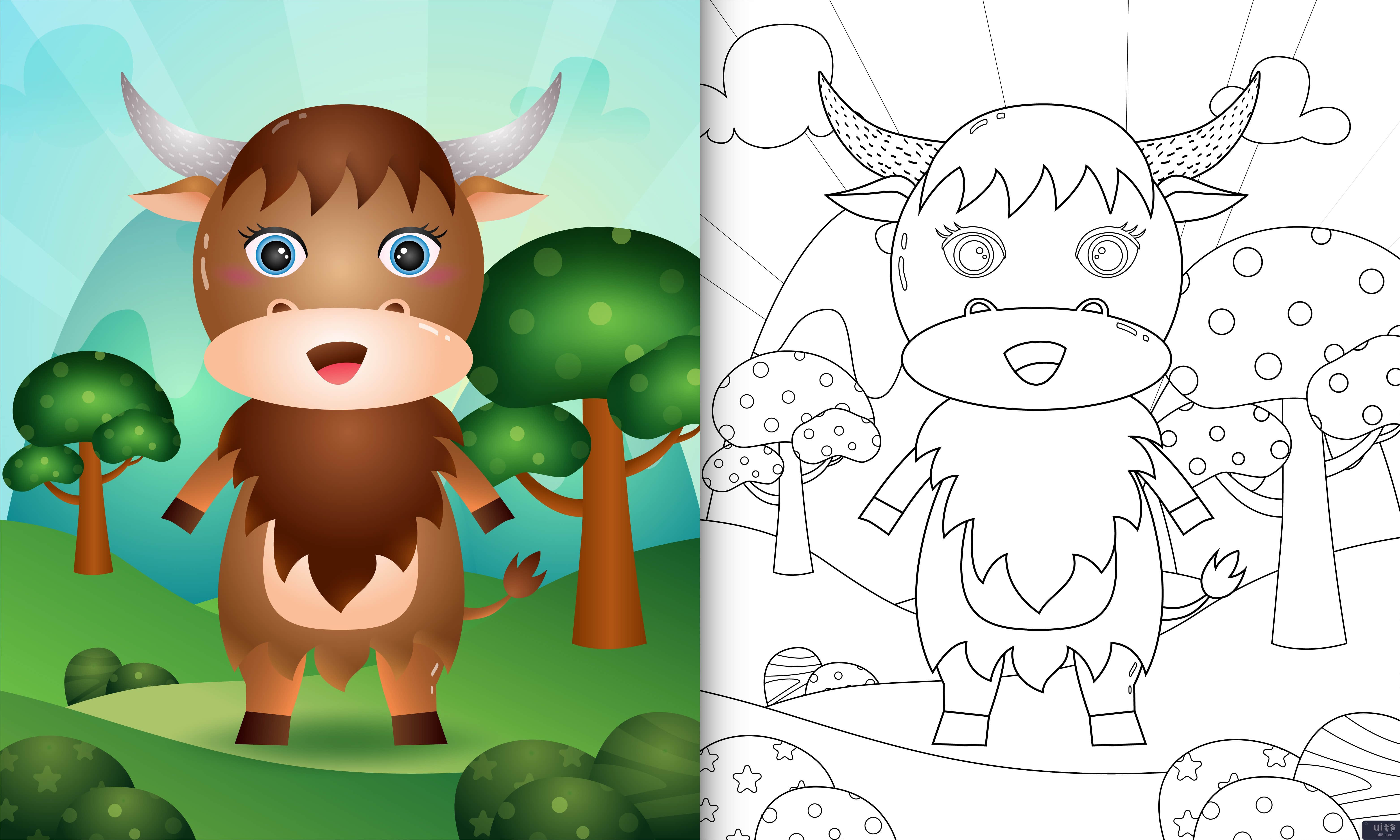 带有可爱水牛角色插图的儿童着色书(coloring book for kids with a cute buffalo character illustration)