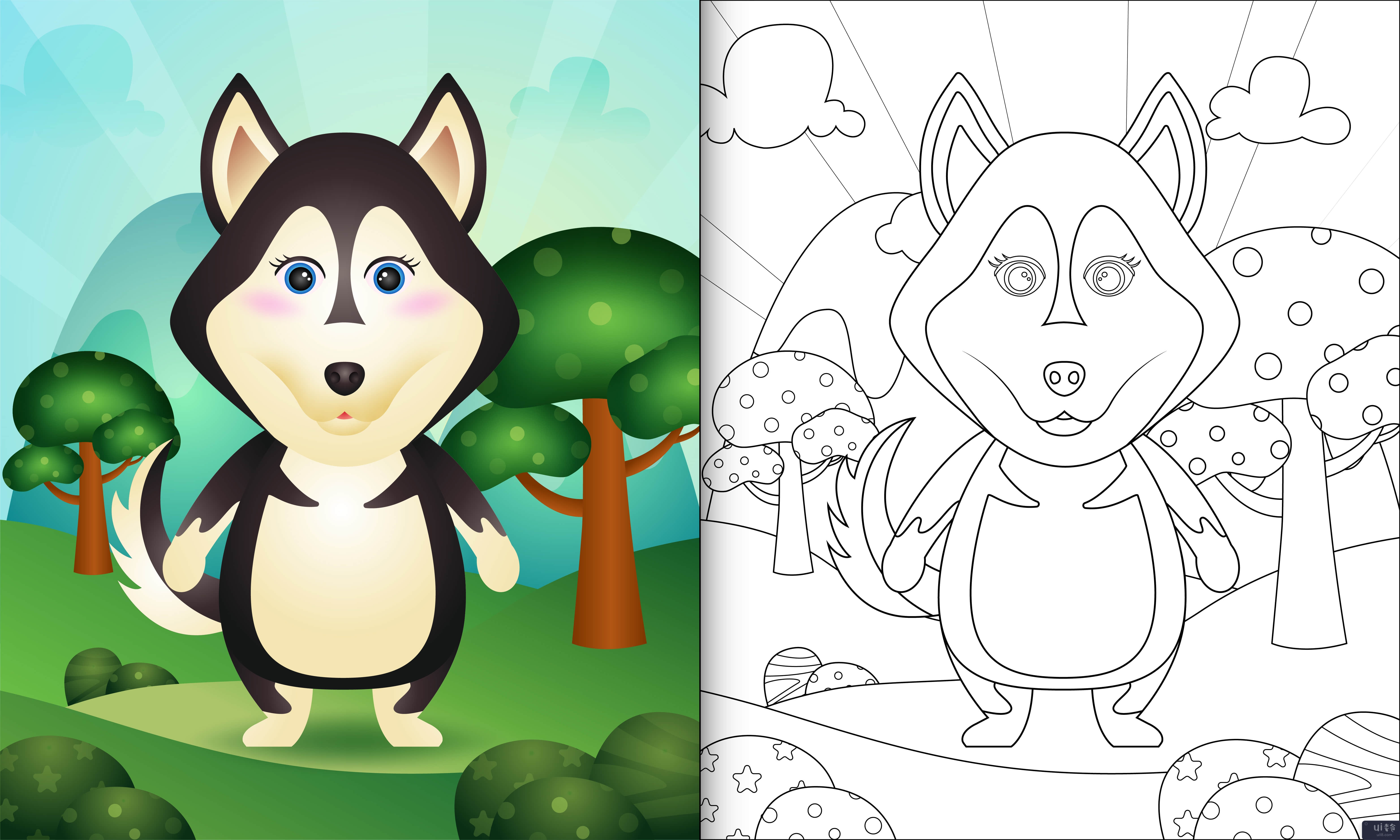 带有可爱哈士奇狗角色插图的儿童着色书(coloring book for kids with a cute husky dog character illustration)