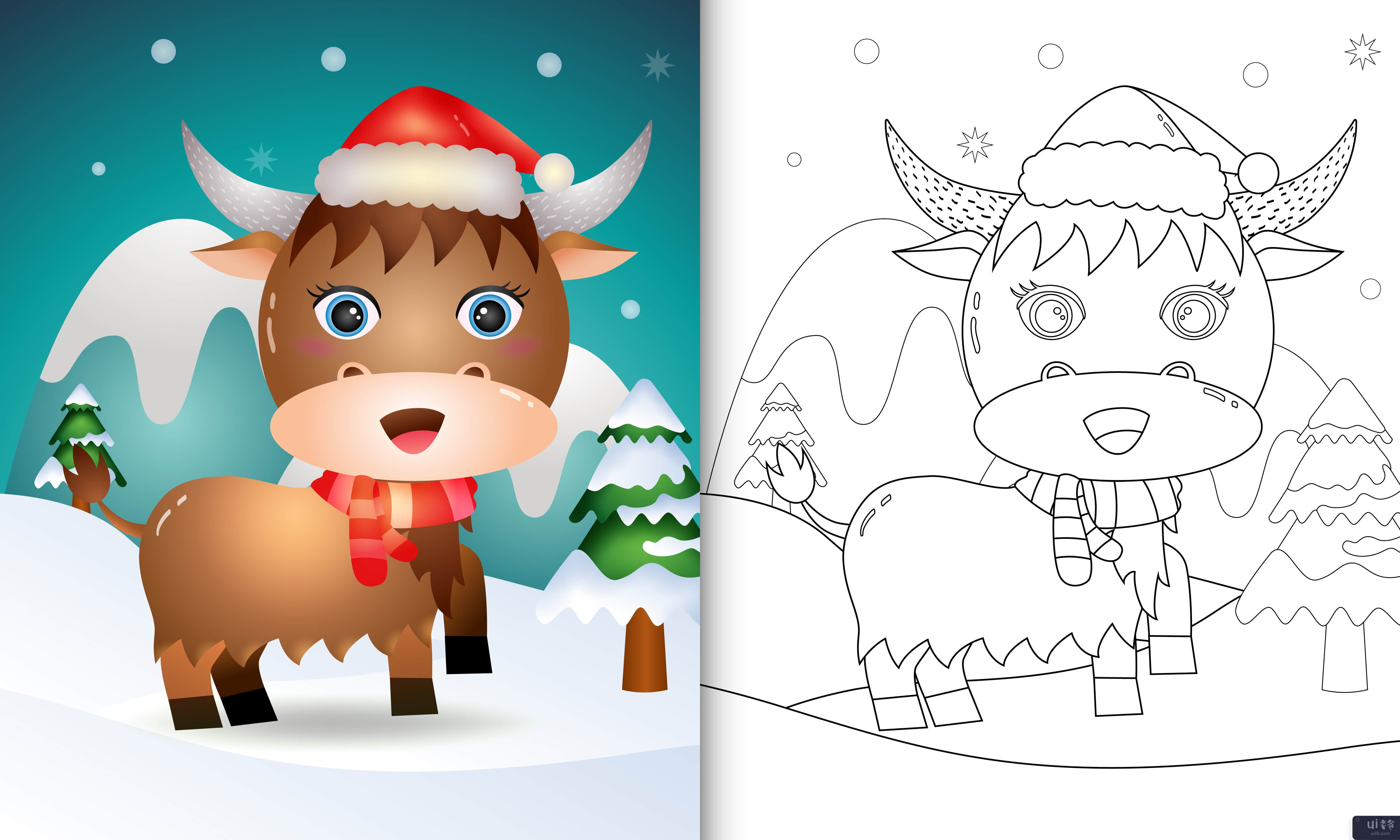 带有可爱水牛圣诞人物的图画书(coloring book with a cute buffalo christmas characters)