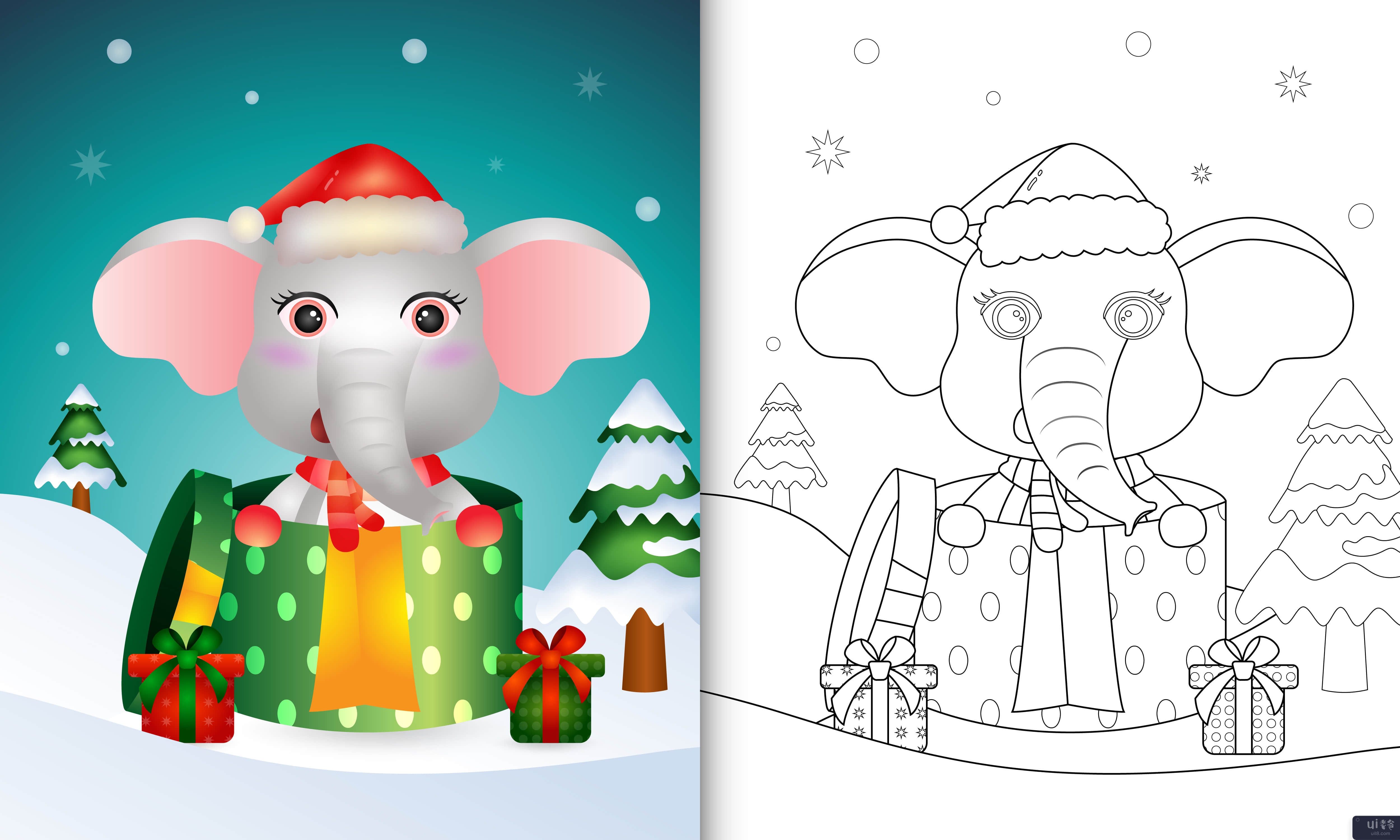 带有可爱的大象圣诞人物的图画书(coloring book with a cute elephant christmas characters)